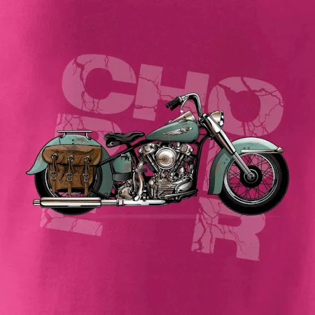 Tričko pre motorkárov, na ktorom je modrá motorka chopper s brašňou. Motocykel by mal mať na tričku každý správny motorkár. Moto tričko s motorkou je vhodný darček pre motorkárov.