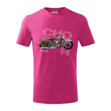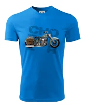 Tričko pre motorkárov, na ktorom je modrá motorka chopper s brašňou. Motocykel by mal mať na tričku každý správny motorkár. Moto tričko s motorkou je vhodný darček pre motorkárov.