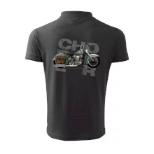 Tričko pre motorkárov, na ktorom je modrá motorka chopper s brašňou. Motocykel by mal mať na tričku každý správny motorkár. Moto tričko s motorkou je vhodný darček pre motorkárov.