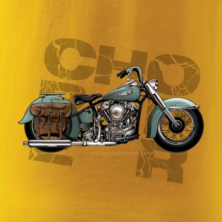 Tričko pre motorkárov, na ktorom je modrá motorka chopper s brašňou. Motocykel by mal mať na tričku každý správny motorkár. Moto tričko s motorkou je vhodný darček pre motorkárov.