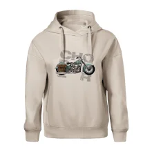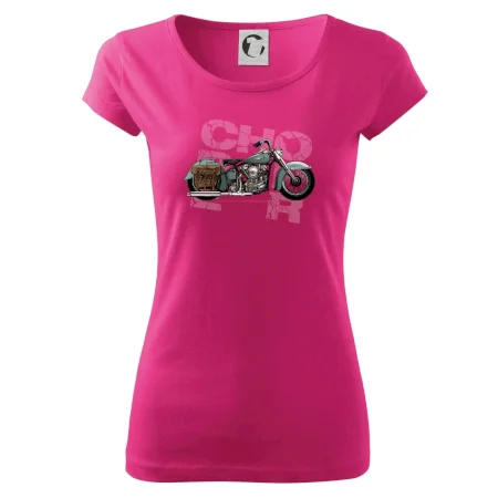 Tričko pre motorkárov, na ktorom je modrá motorka chopper s brašňou. Motocykel by mal mať na tričku každý správny motorkár. Moto tričko s motorkou je vhodný darček pre motorkárov.