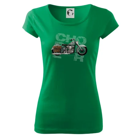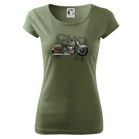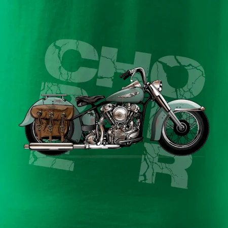 Tričko pre motorkárov, na ktorom je modrá motorka chopper s brašňou. Motocykel by mal mať na tričku každý správny motorkár. Moto tričko s motorkou je vhodný darček pre motorkárov.
