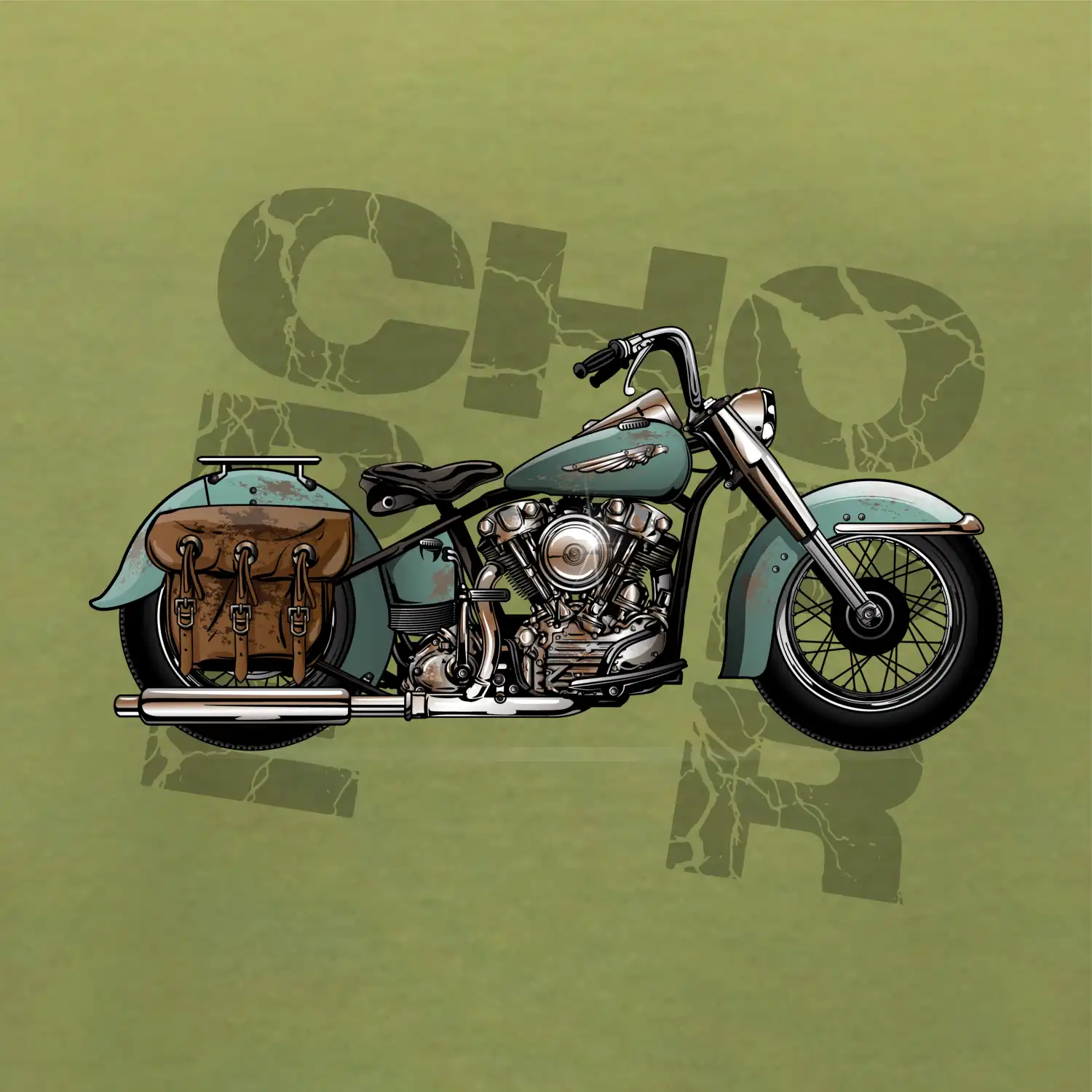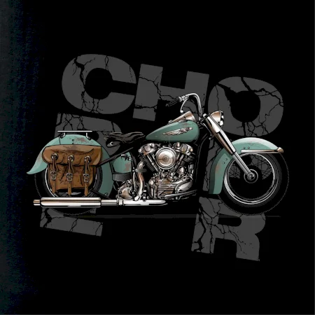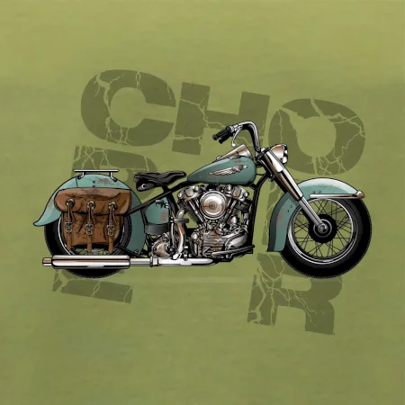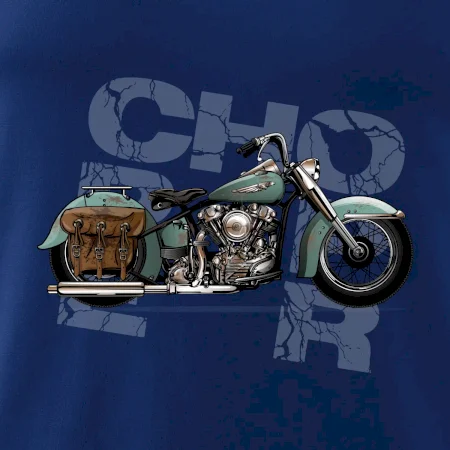 Tričko pre motorkárov, na ktorom je modrá motorka chopper s brašňou. Motocykel by mal mať na tričku každý správny motorkár. Moto tričko s motorkou je vhodný darček pre motorkárov.