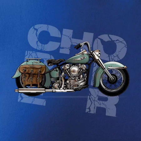Tričko pre motorkárov, na ktorom je modrá motorka chopper s brašňou. Motocykel by mal mať na tričku každý správny motorkár. Moto tričko s motorkou je vhodný darček pre motorkárov.