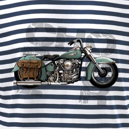 Tričko pre motorkárov, na ktorom je modrá motorka chopper s brašňou. Motocykel by mal mať na tričku každý správny motorkár. Moto tričko s motorkou je vhodný darček pre motorkárov.