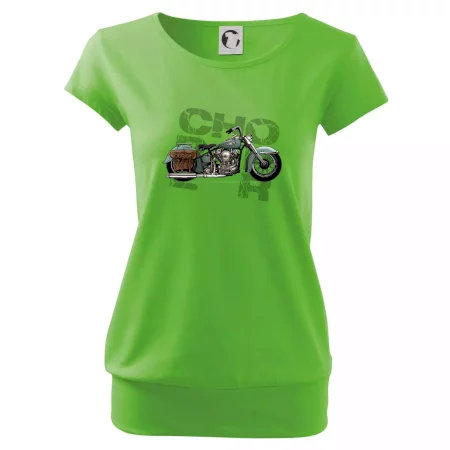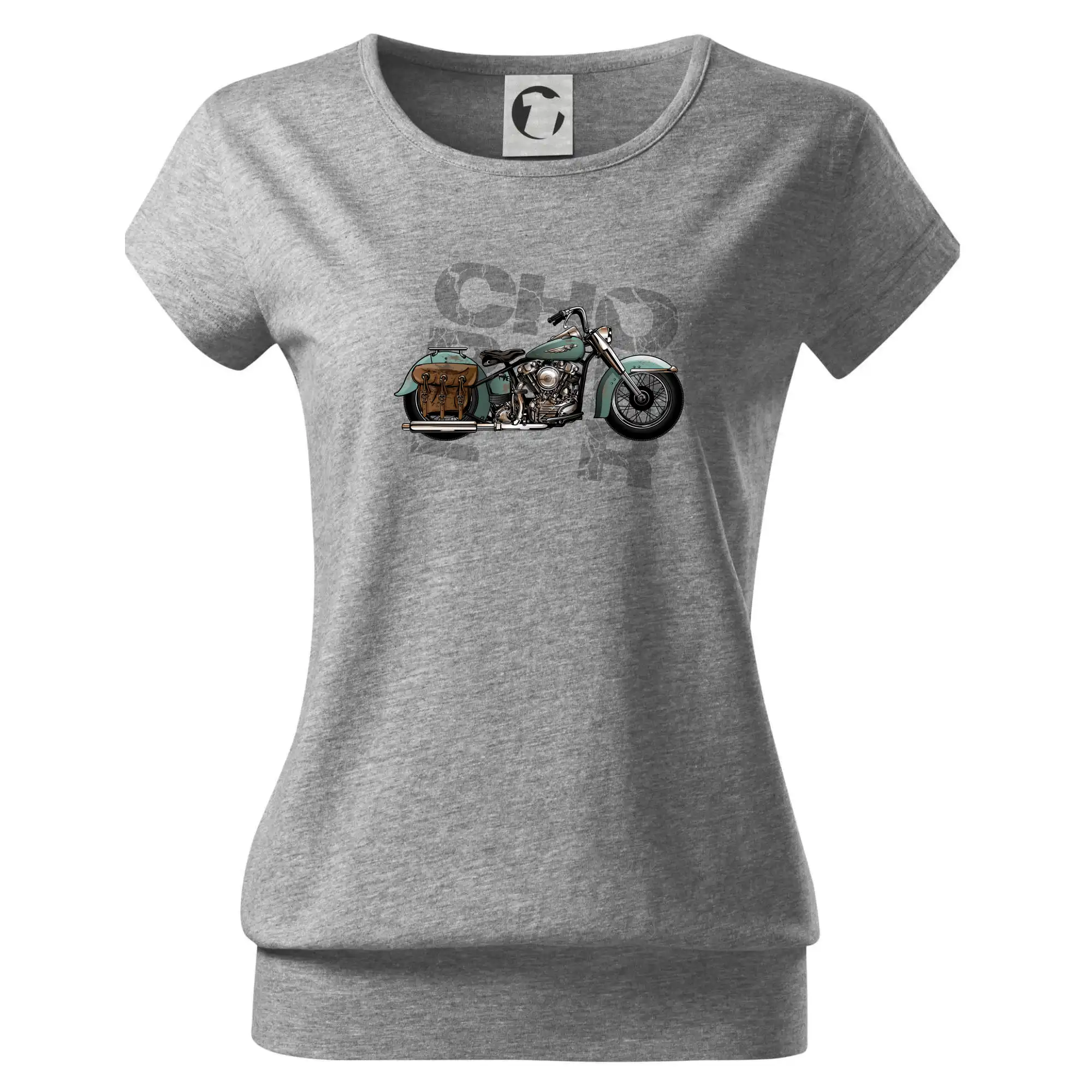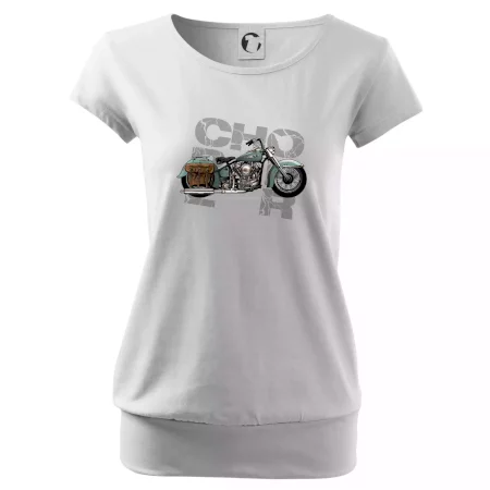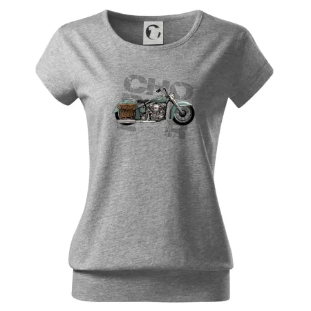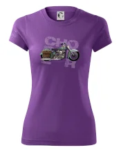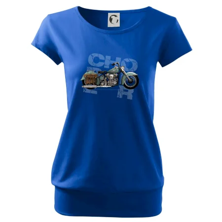 Tričko pre motorkárov, na ktorom je modrá motorka chopper s brašňou. Motocykel by mal mať na tričku každý správny motorkár. Moto tričko s motorkou je vhodný darček pre motorkárov.