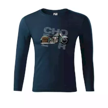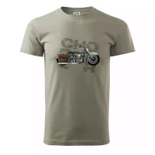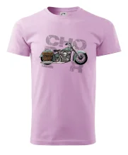 Tričko pre motorkárov, na ktorom je modrá motorka chopper s brašňou. Motocykel by mal mať na tričku každý správny motorkár. Moto tričko s motorkou je vhodný darček pre motorkárov.