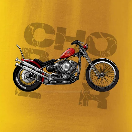 Tričko pre motorkárov, na ktorom je červená motorka chopper. Motocykel by mal mať na tričku každý správny motorkár. Moto tričko s motorkou je vhodný darček pre motorkárov.