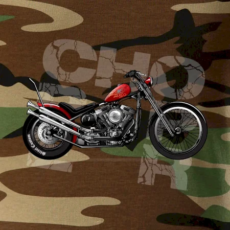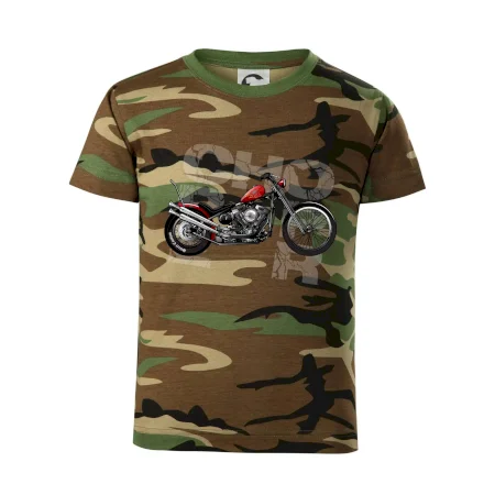 Tričko pre motorkárov, na ktorom je červená motorka chopper. Motocykel by mal mať na tričku každý správny motorkár. Moto tričko s motorkou je vhodný darček pre motorkárov.