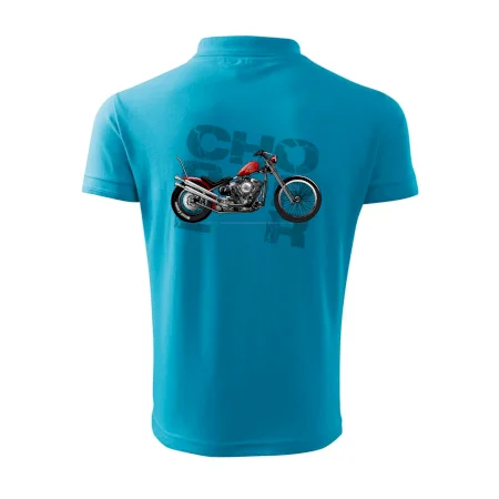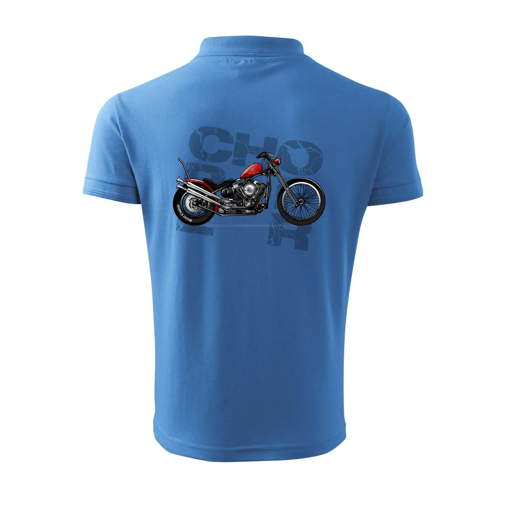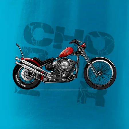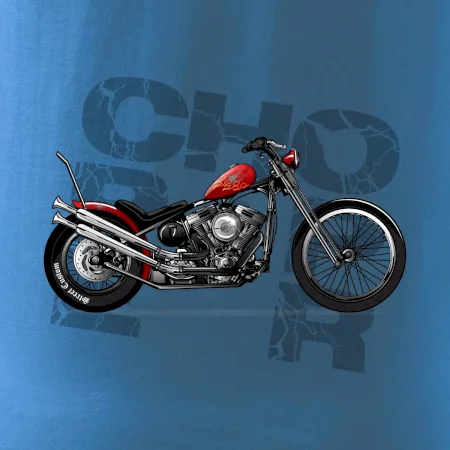 Tričko pre motorkárov, na ktorom je červená motorka chopper. Motocykel by mal mať na tričku každý správny motorkár. Moto tričko s motorkou je vhodný darček pre motorkárov.