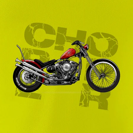 Tričko pre motorkárov, na ktorom je červená motorka chopper. Motocykel by mal mať na tričku každý správny motorkár. Moto tričko s motorkou je vhodný darček pre motorkárov.