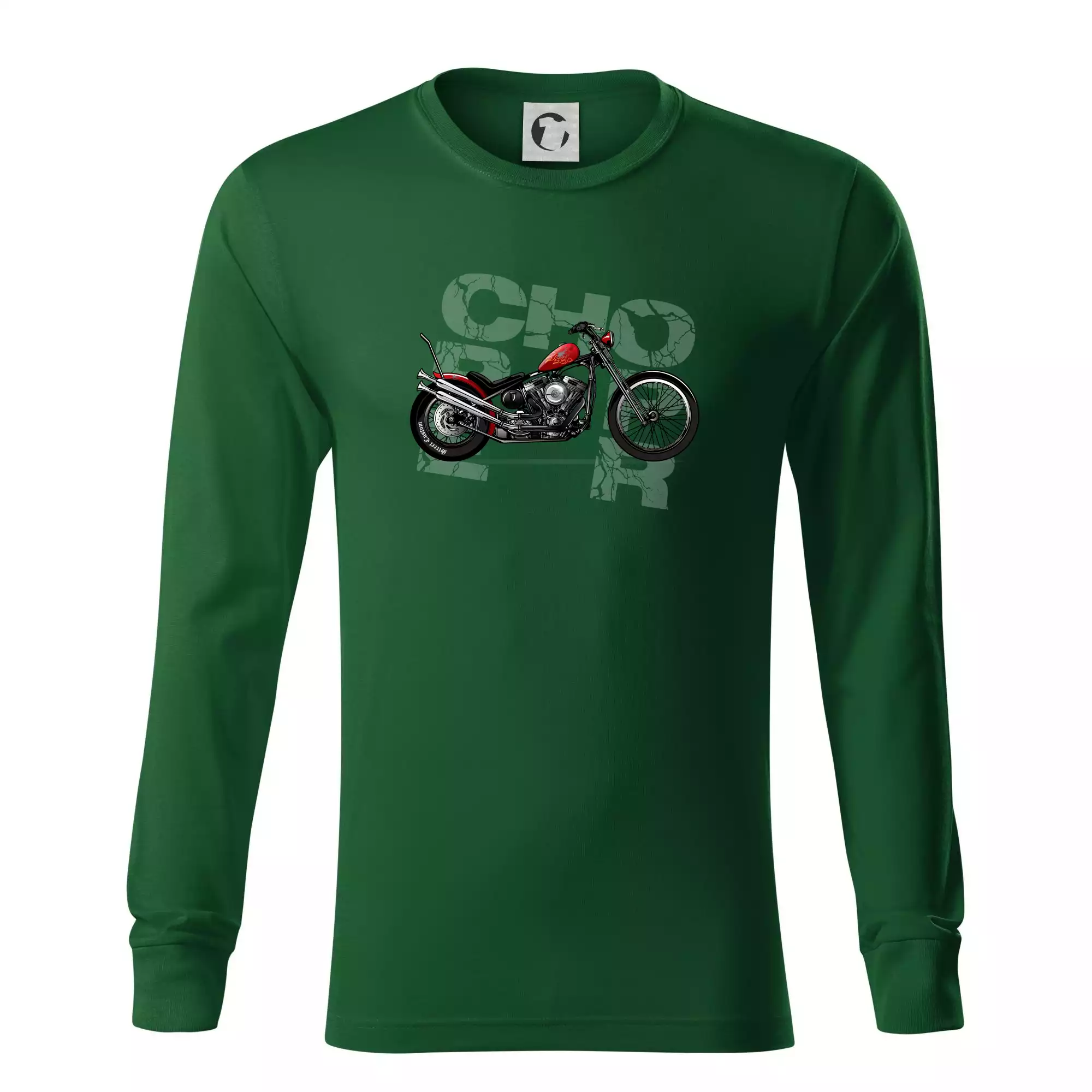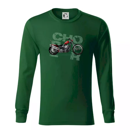Tričko pre motorkárov, na ktorom je červená motorka chopper. Motocykel by mal mať na tričku každý správny motorkár. Moto tričko s motorkou je vhodný darček pre motorkárov.