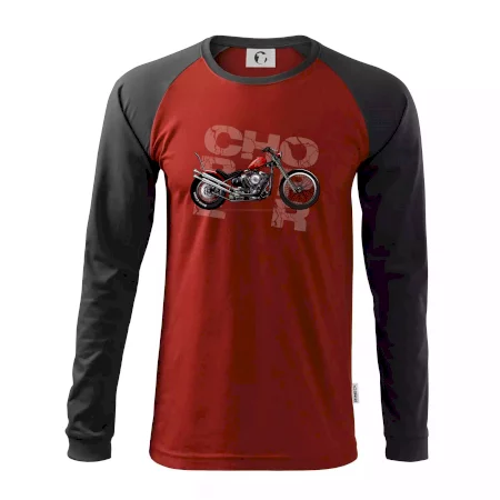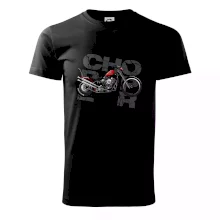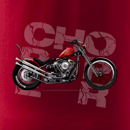 Tričko pre motorkárov, na ktorom je červená motorka chopper. Motocykel by mal mať na tričku každý správny motorkár. Moto tričko s motorkou je vhodný darček pre motorkárov.