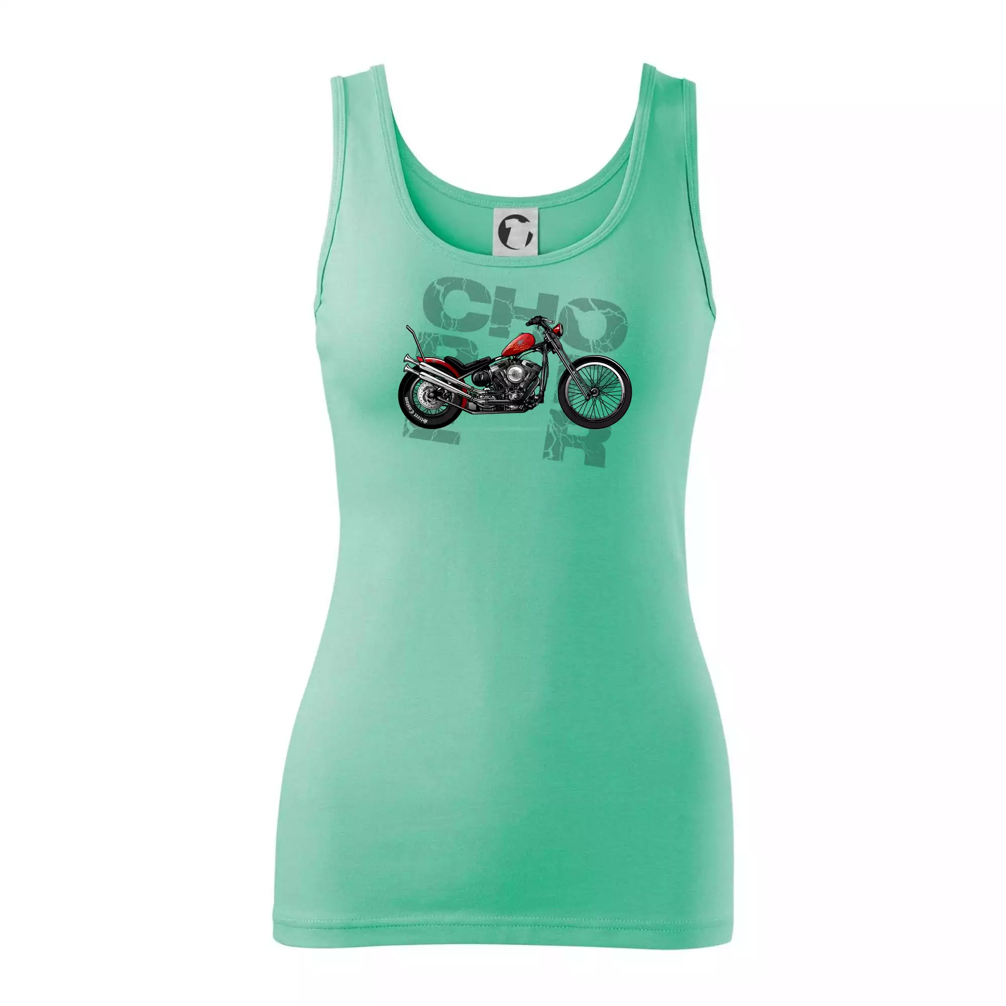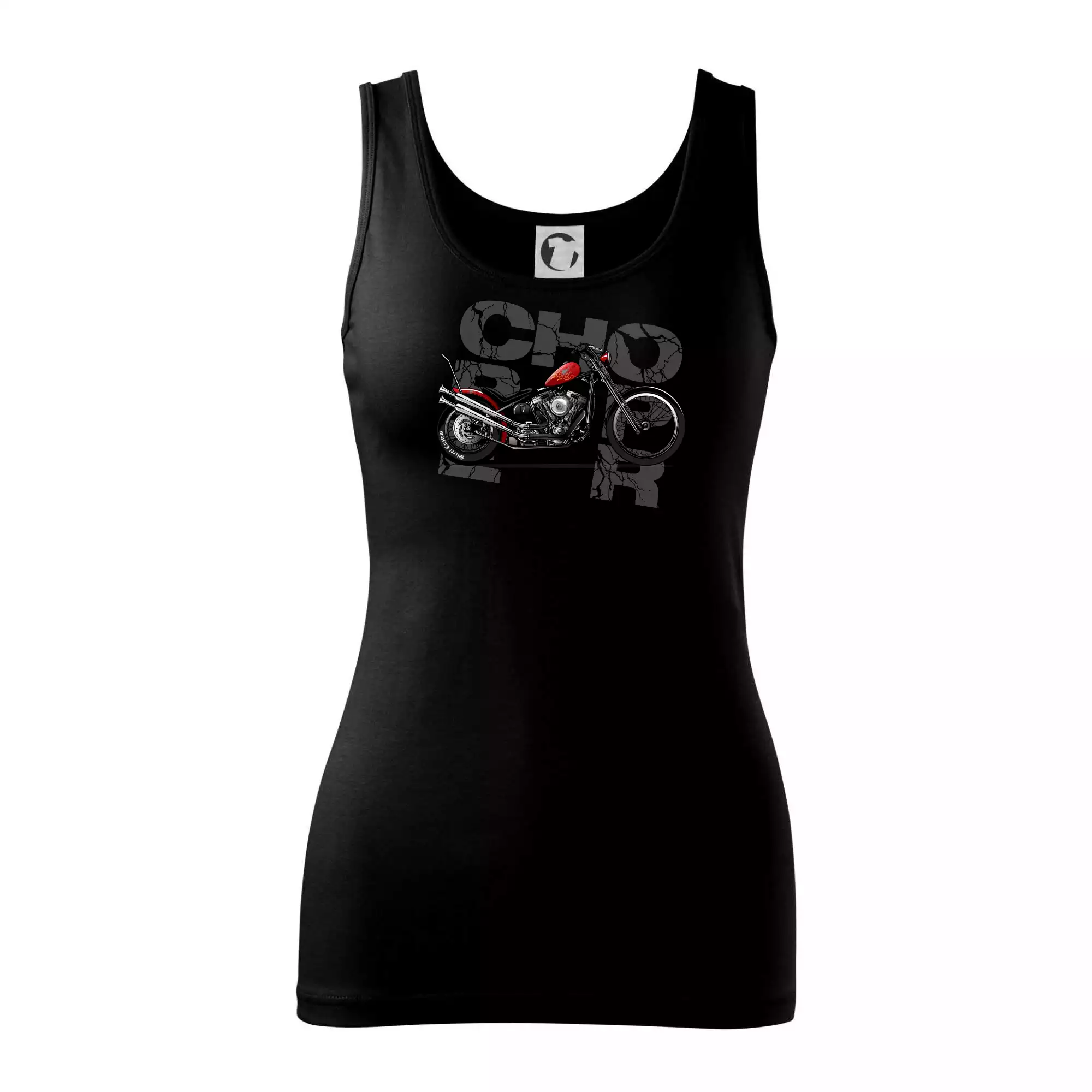 Tričko pre motorkárov, na ktorom je červená motorka chopper. Motocykel by mal mať na tričku každý správny motorkár. Moto tričko s motorkou je vhodný darček pre motorkárov.