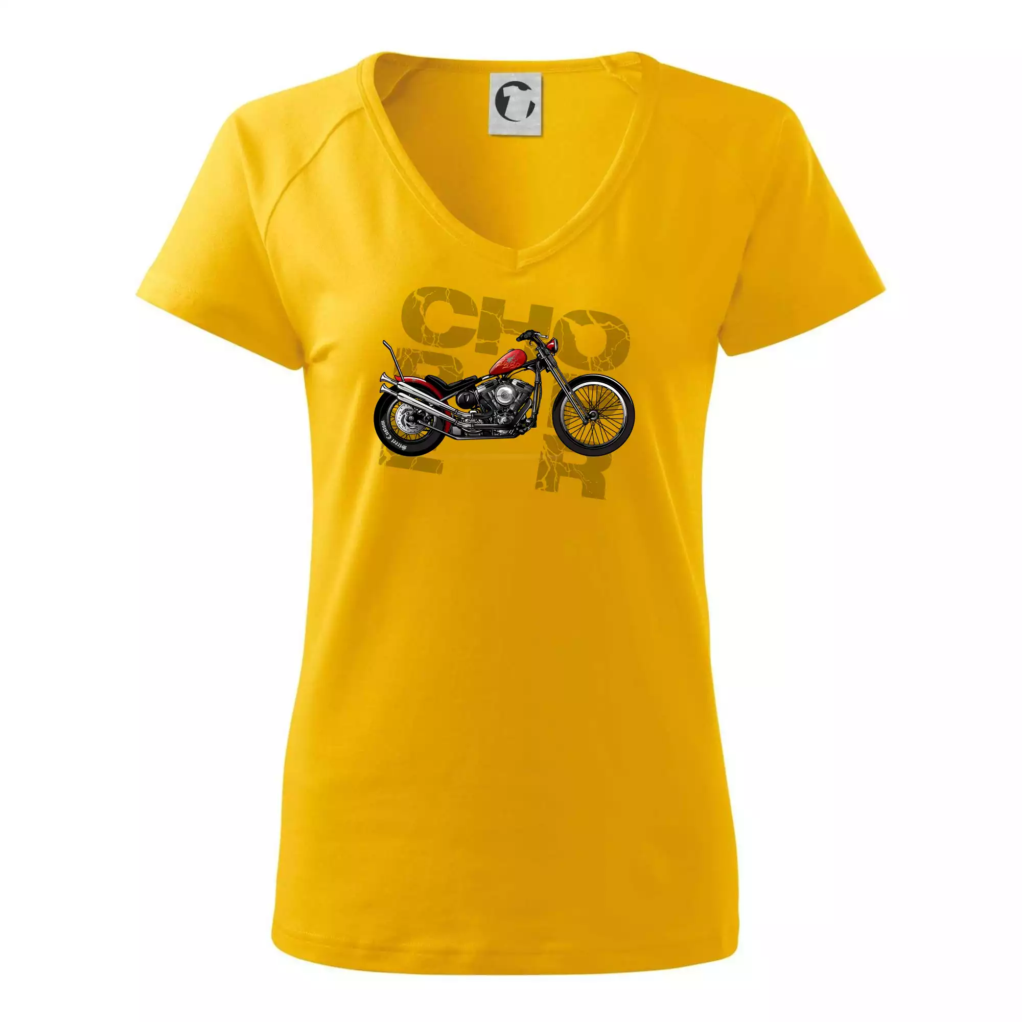 Tričko pre motorkárov, na ktorom je červená motorka chopper. Motocykel by mal mať na tričku každý správny motorkár. Moto tričko s motorkou je vhodný darček pre motorkárov.