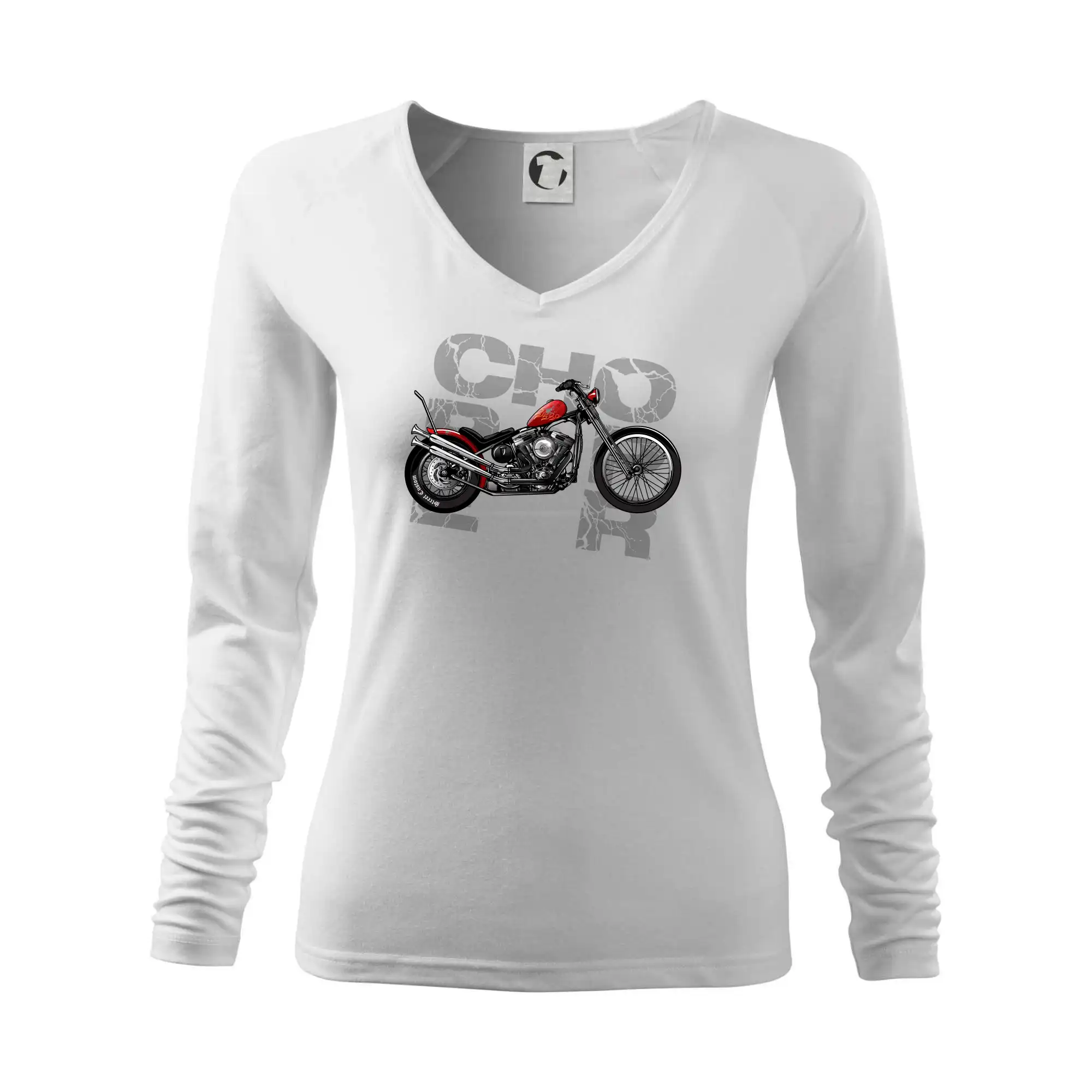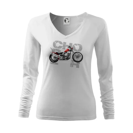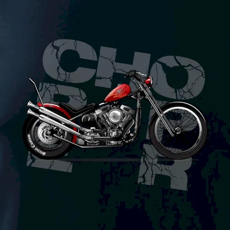 Tričko pre motorkárov, na ktorom je červená motorka chopper. Motocykel by mal mať na tričku každý správny motorkár. Moto tričko s motorkou je vhodný darček pre motorkárov.