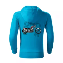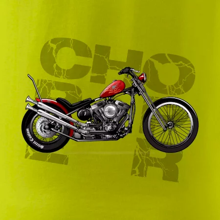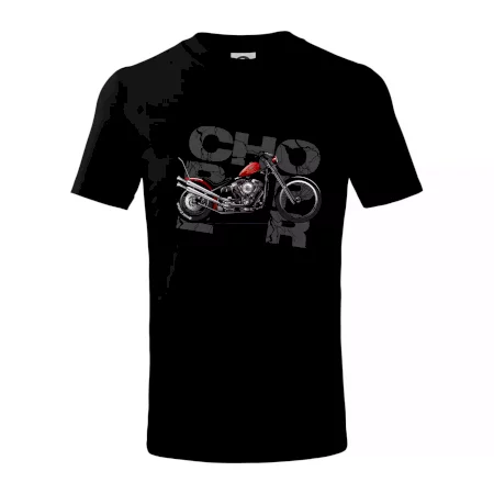 Tričko pre motorkárov, na ktorom je červená motorka chopper. Motocykel by mal mať na tričku každý správny motorkár. Moto tričko s motorkou je vhodný darček pre motorkárov.