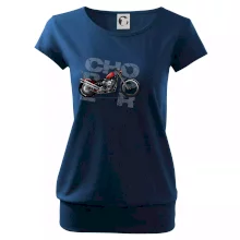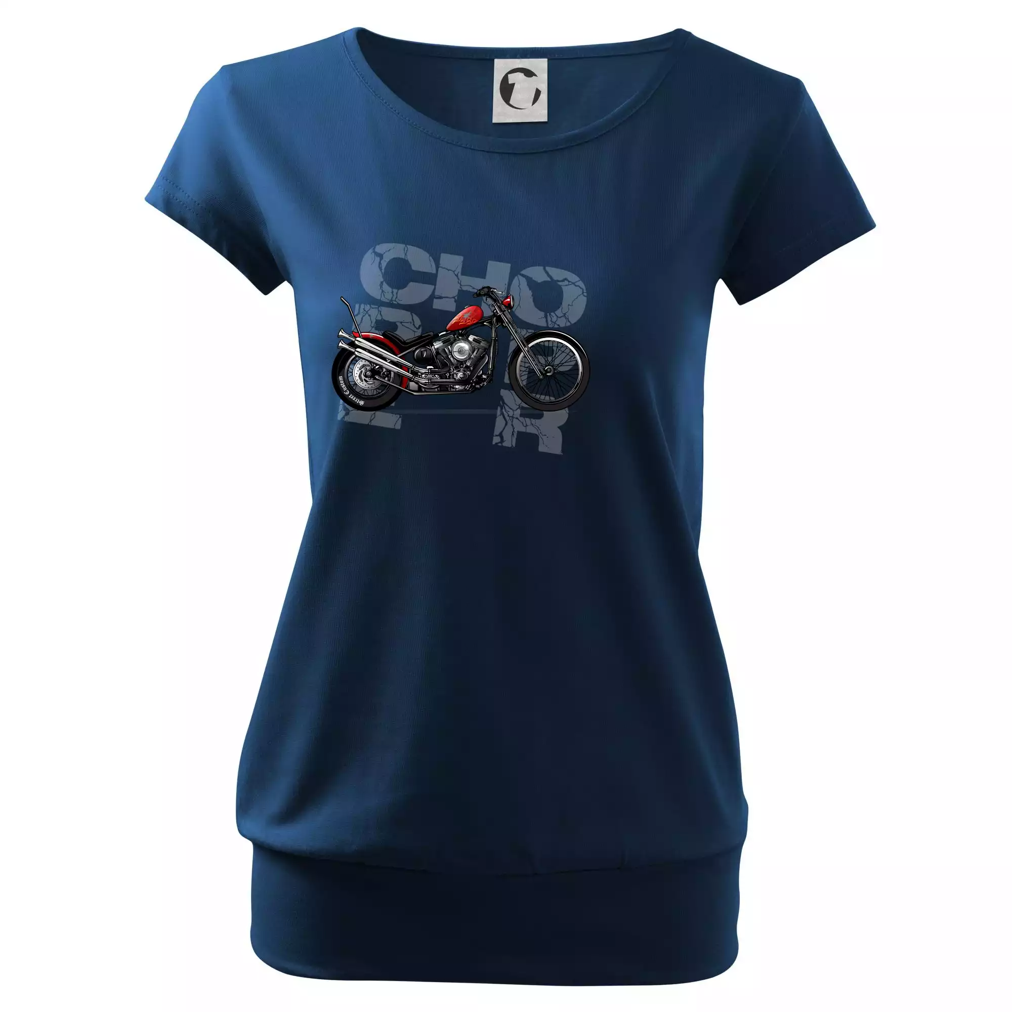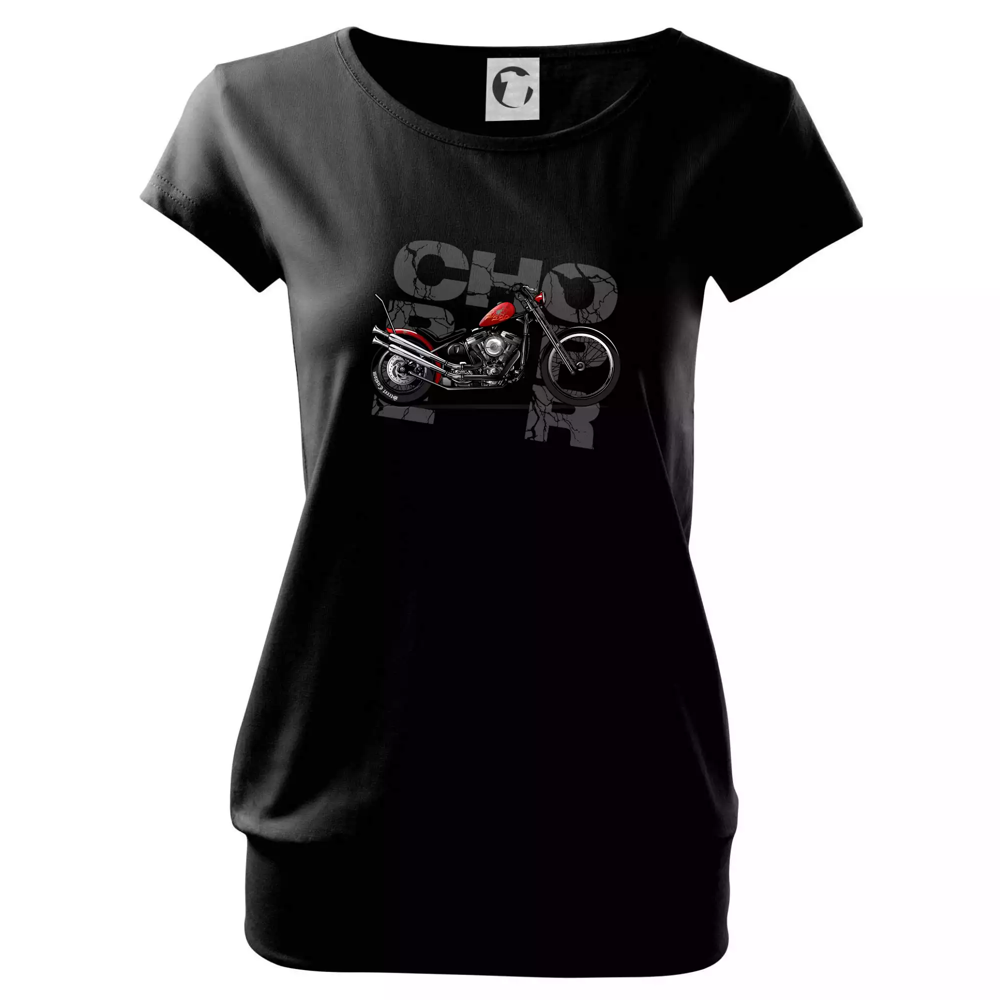 Tričko pre motorkárov, na ktorom je červená motorka chopper. Motocykel by mal mať na tričku každý správny motorkár. Moto tričko s motorkou je vhodný darček pre motorkárov.
