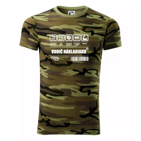 Tričko strednej gramáže vo farbách camouflage. Strih s bočnými švami. Lem priekrčníku z rebrového úpletu s prídavkom 5% elastanu. Vnútorná časť zadného priekrčníka začistená páskou vo farbe camouflage.