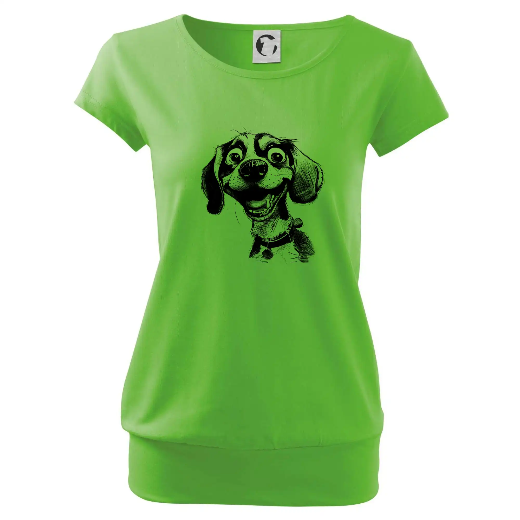 Trendové dámske tričko s veľmi krátkym rukávom, voľnejšieho strihu, v dolnom kraji všité do širokého lemu. Okrúhly priekrčník s úzkym lemom zo zhodného materiálu.