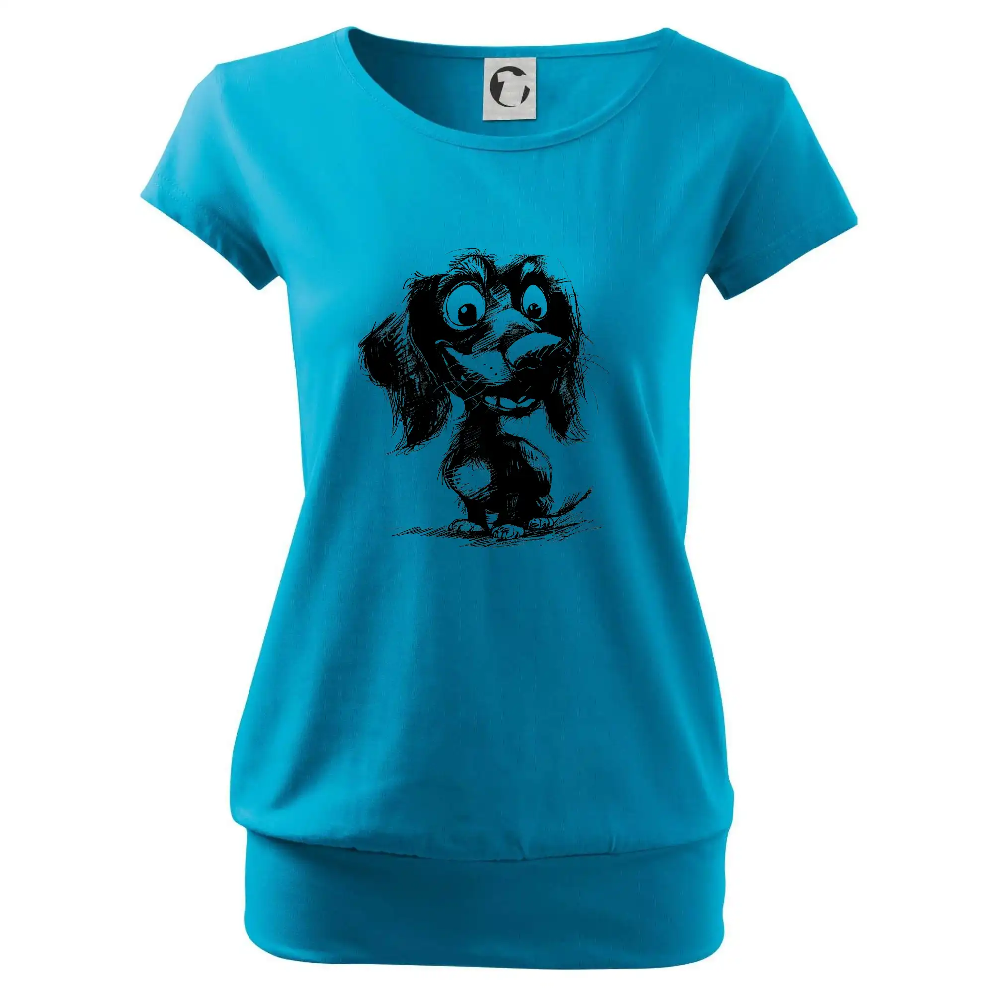 Trendové dámske tričko s veľmi krátkym rukávom, voľnejšieho strihu, v dolnom kraji všité do širokého lemu. Okrúhly priekrčník s úzkym lemom zo zhodného materiálu.