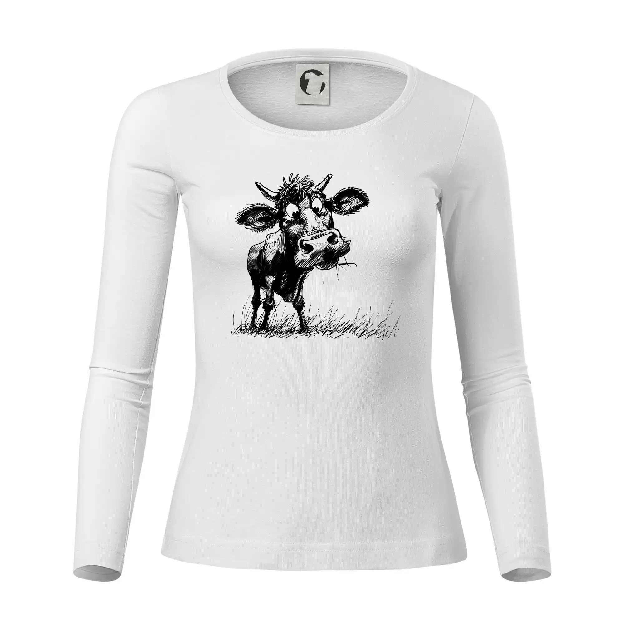 Čiernobiela karikatúra krava stojaca
