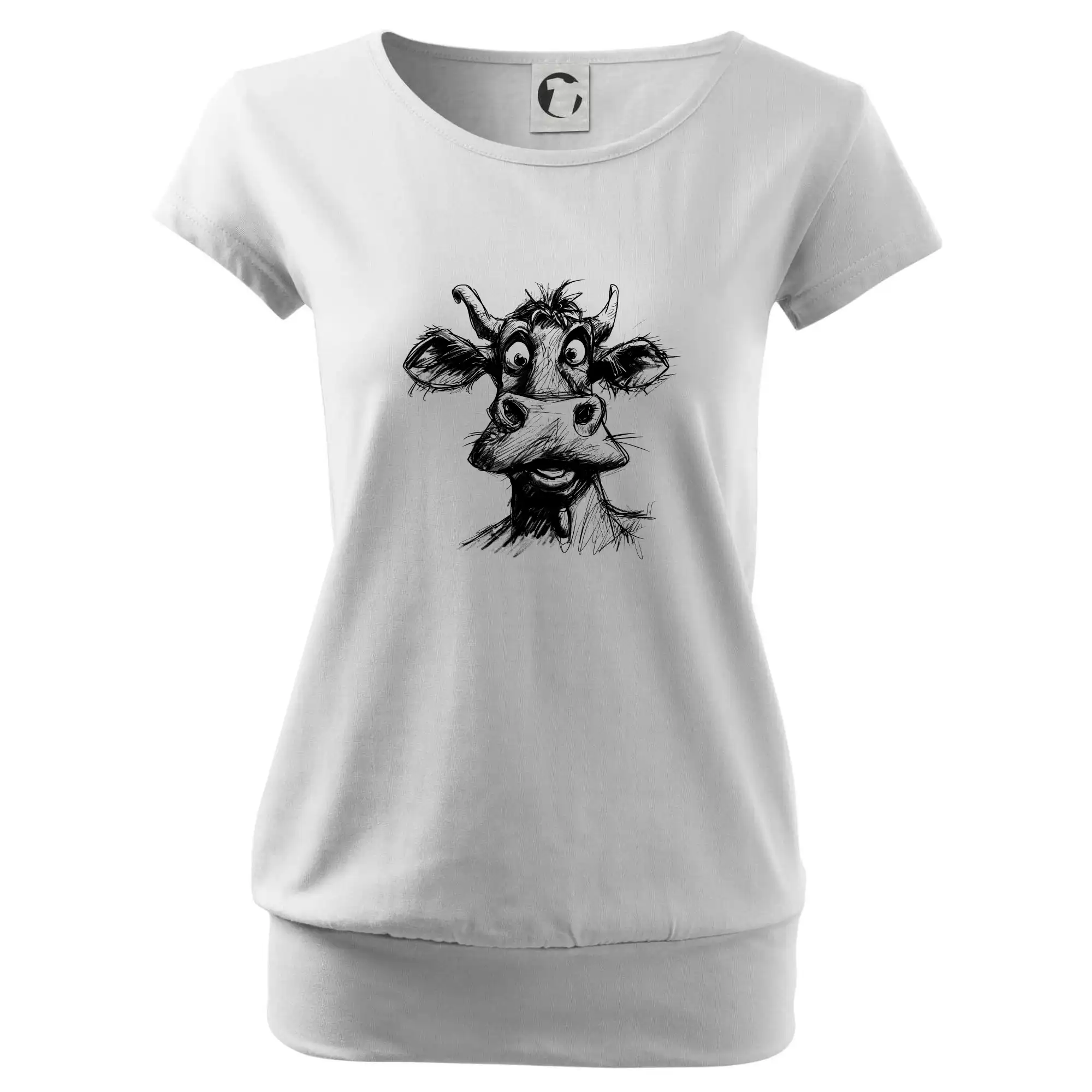 Trendové dámske tričko s veľmi krátkym rukávom, voľnejšieho strihu, v dolnom kraji všité do širokého lemu. Okrúhly priekrčník s úzkym lemom zo zhodného materiálu.
