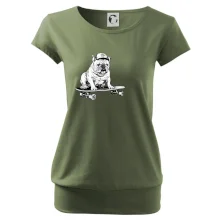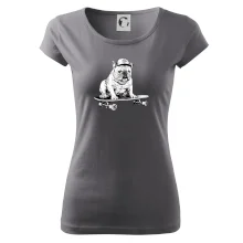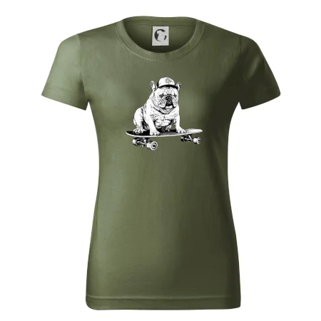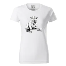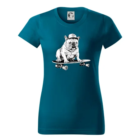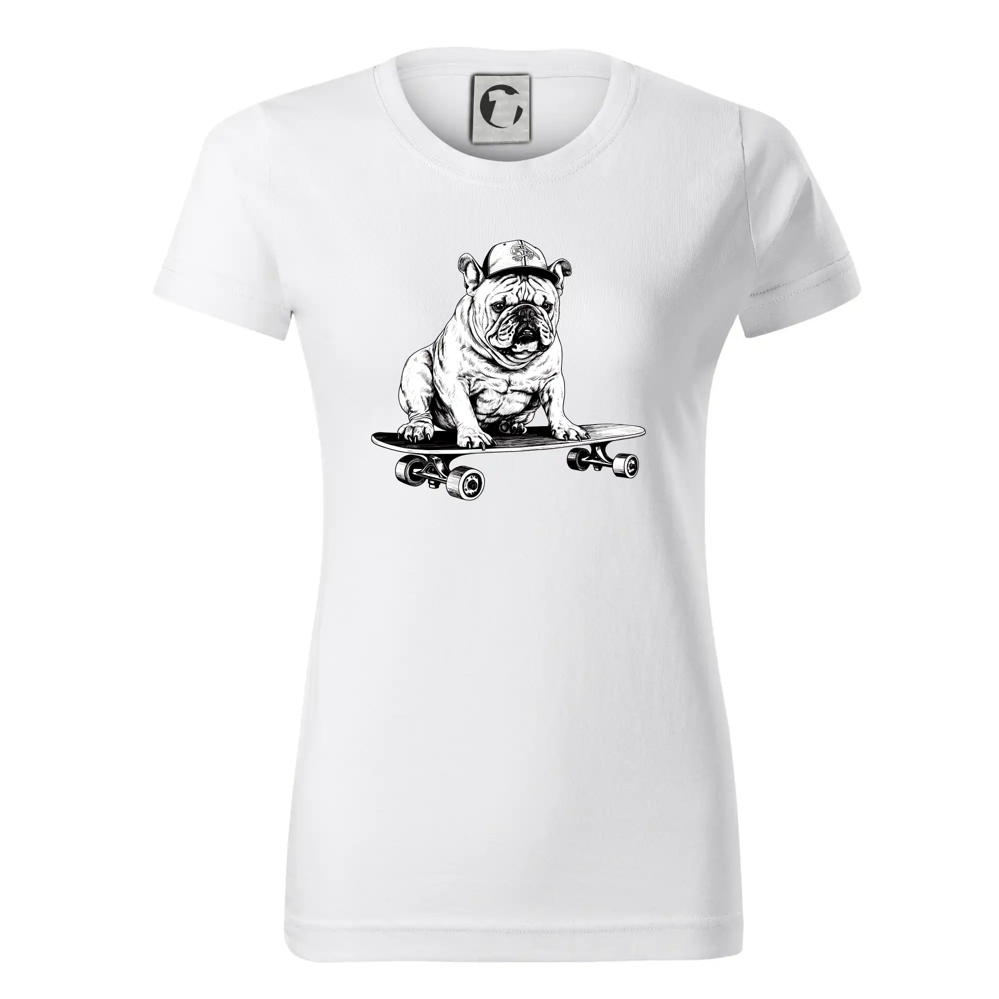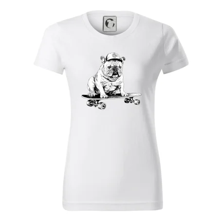 Čiernobiely buldog na skateboarde