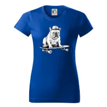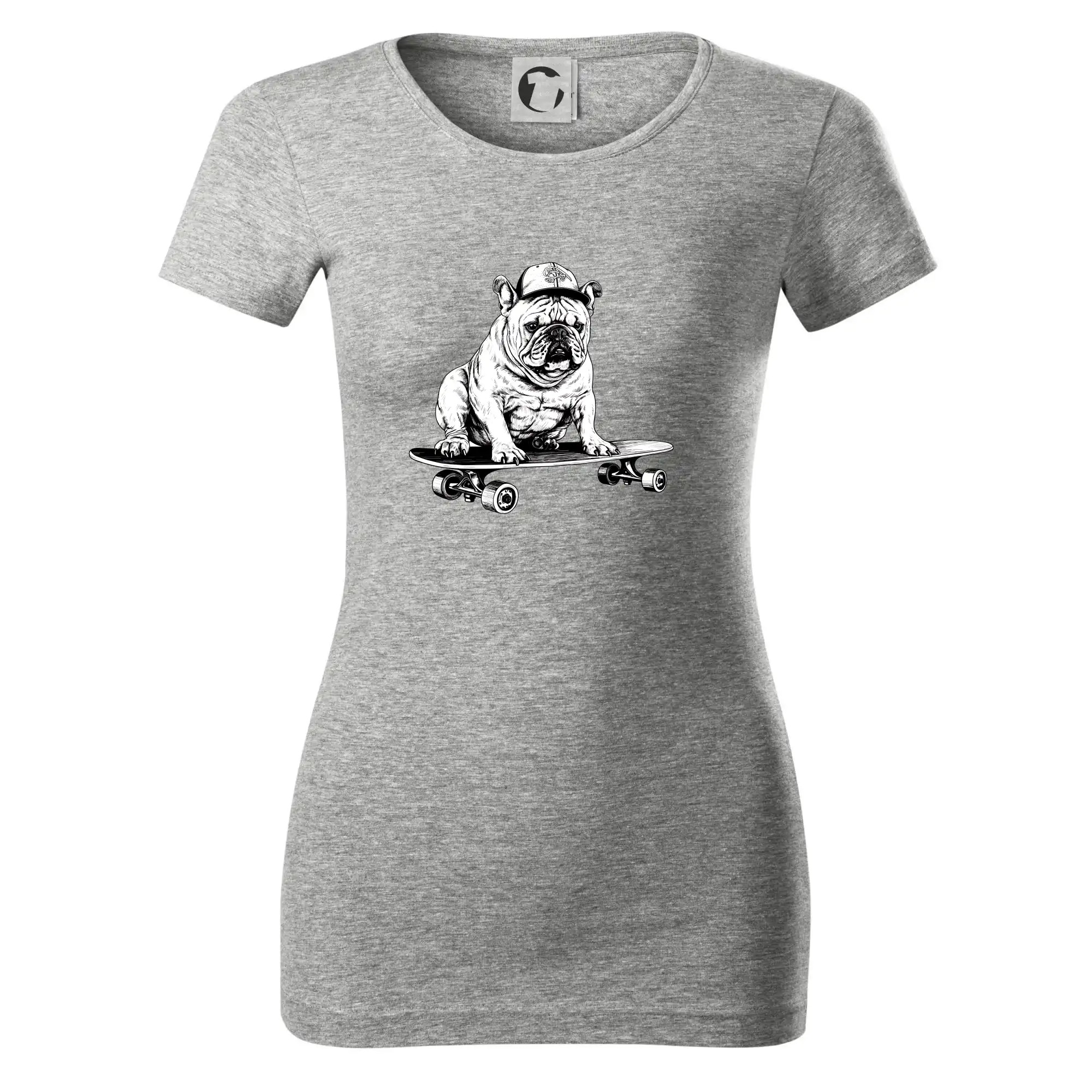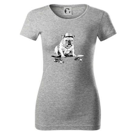 Čiernobiely buldog na skateboarde