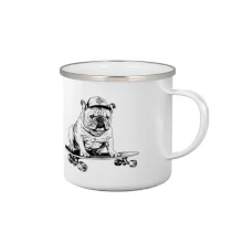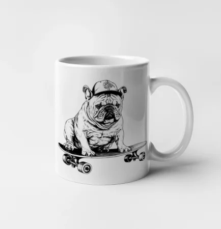 Čiernobiely buldog na skateboarde