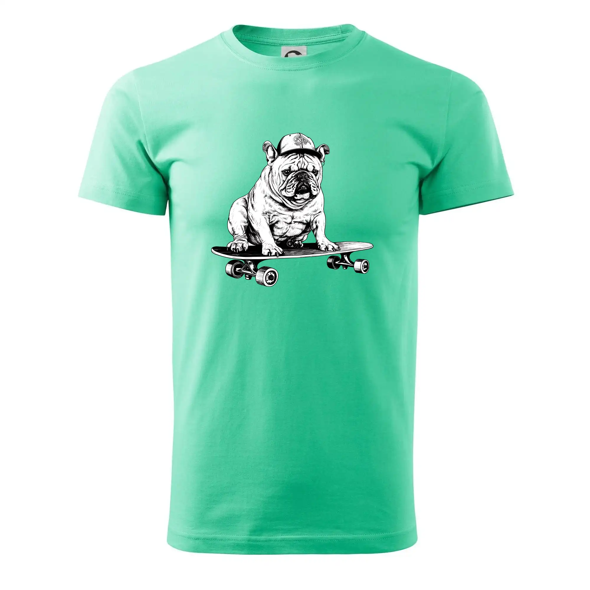 Čiernobiely buldog na skateboarde