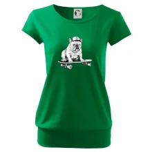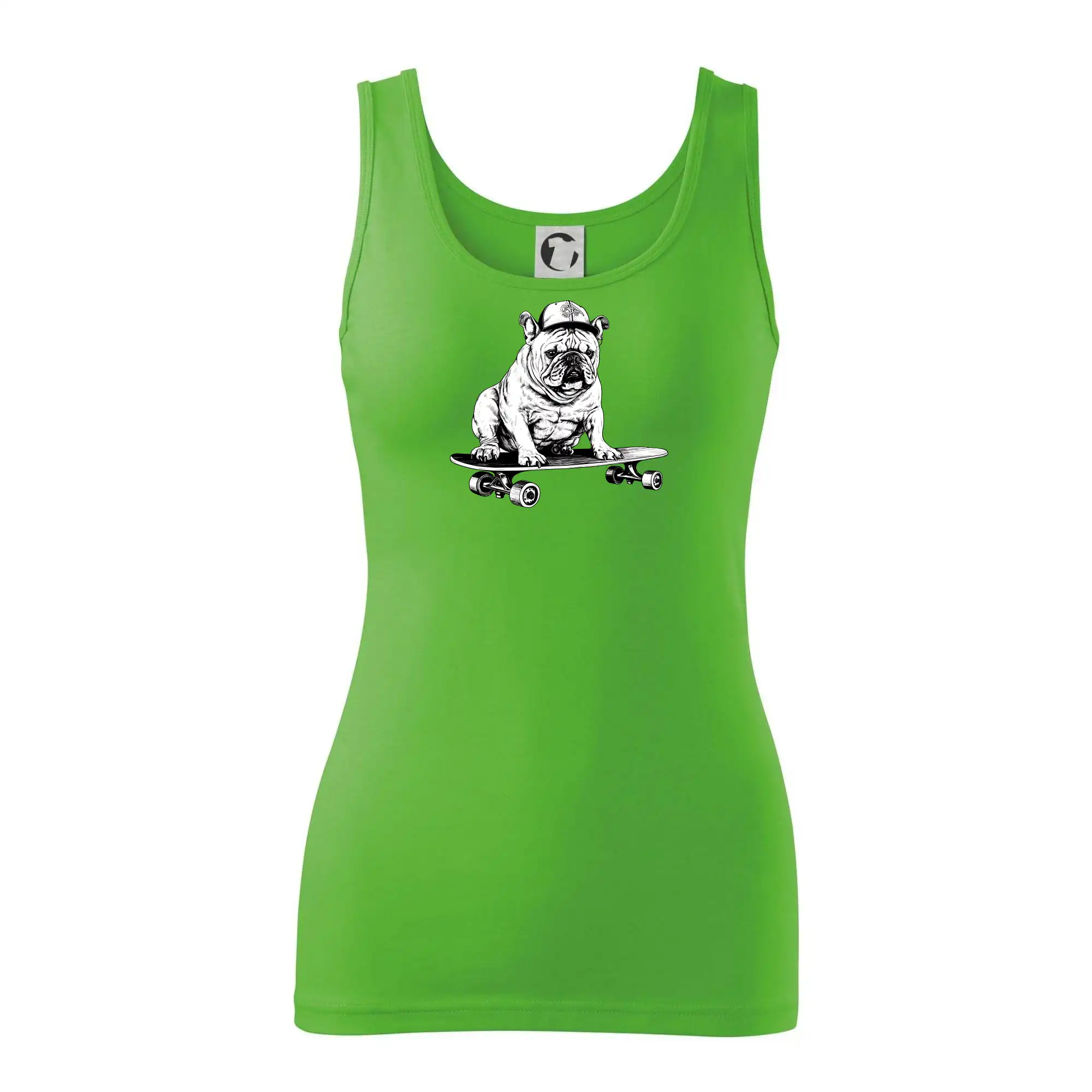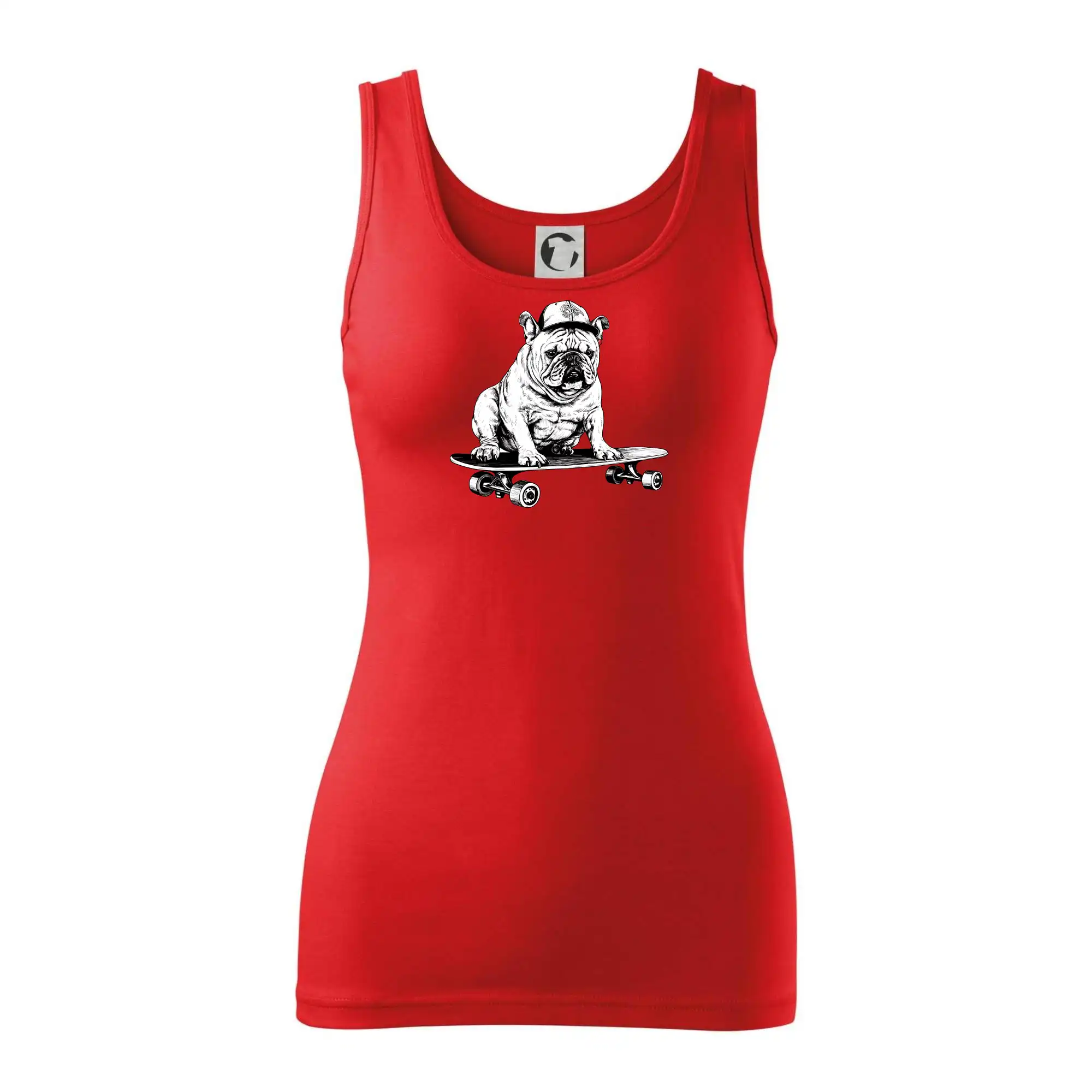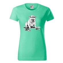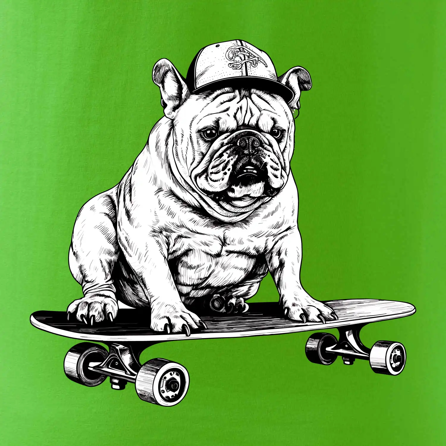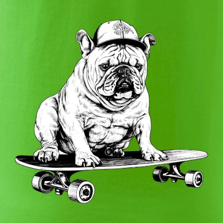 Čiernobiely buldog na skateboarde