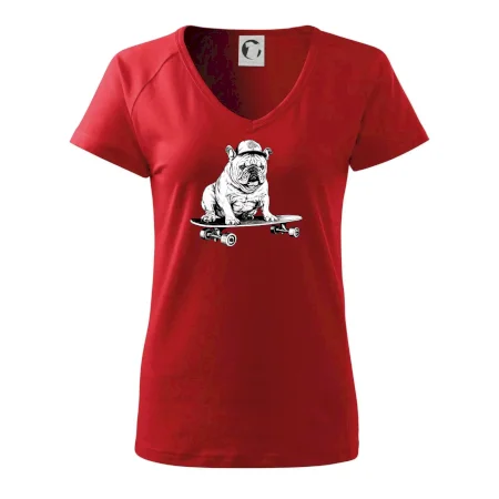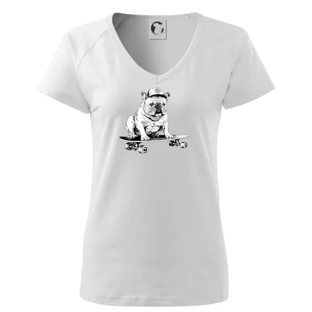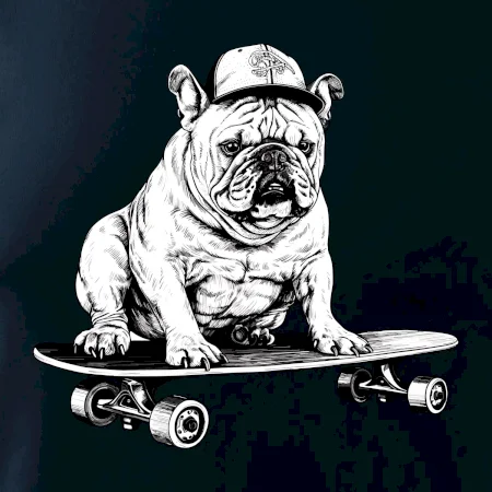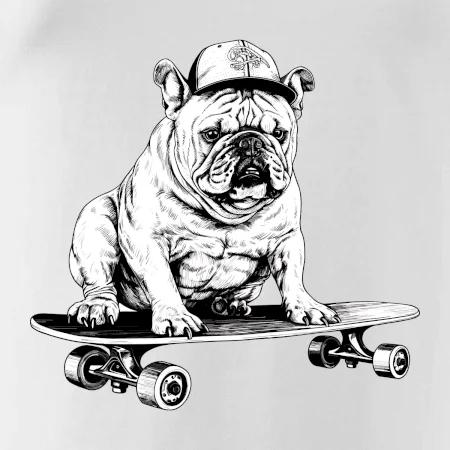 Čiernobiely buldog na skateboarde