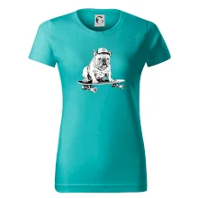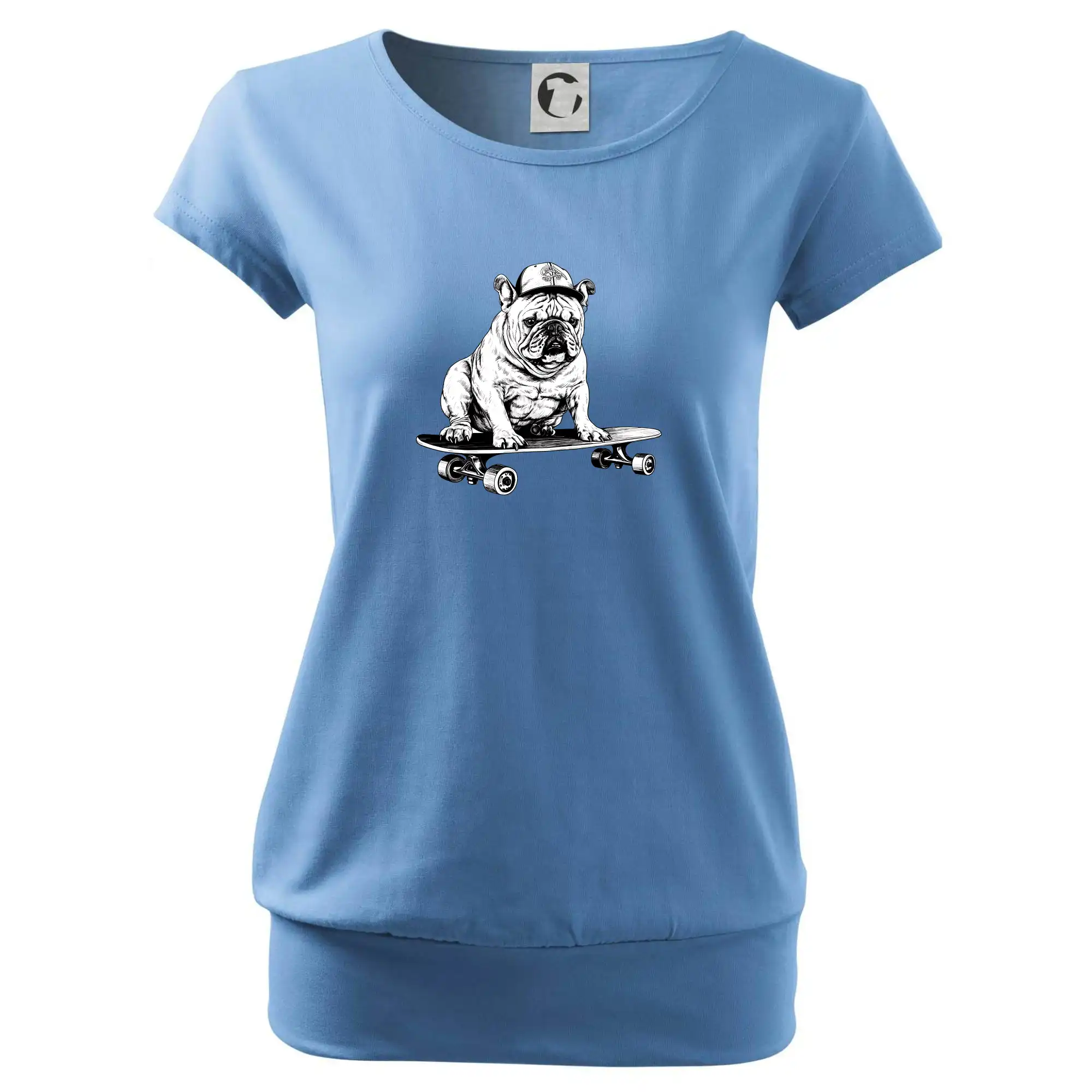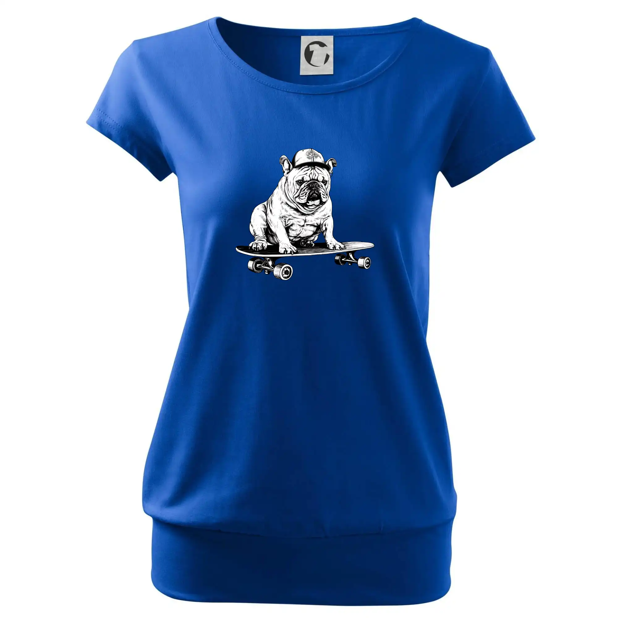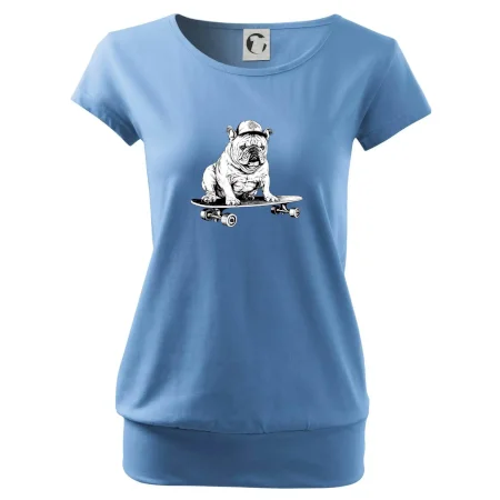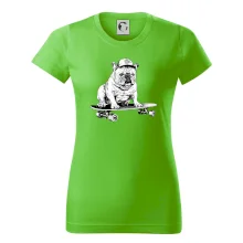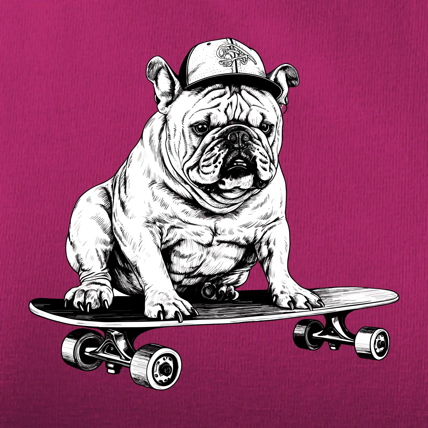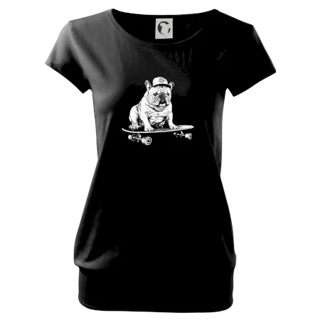 Čiernobiely buldog na skateboarde