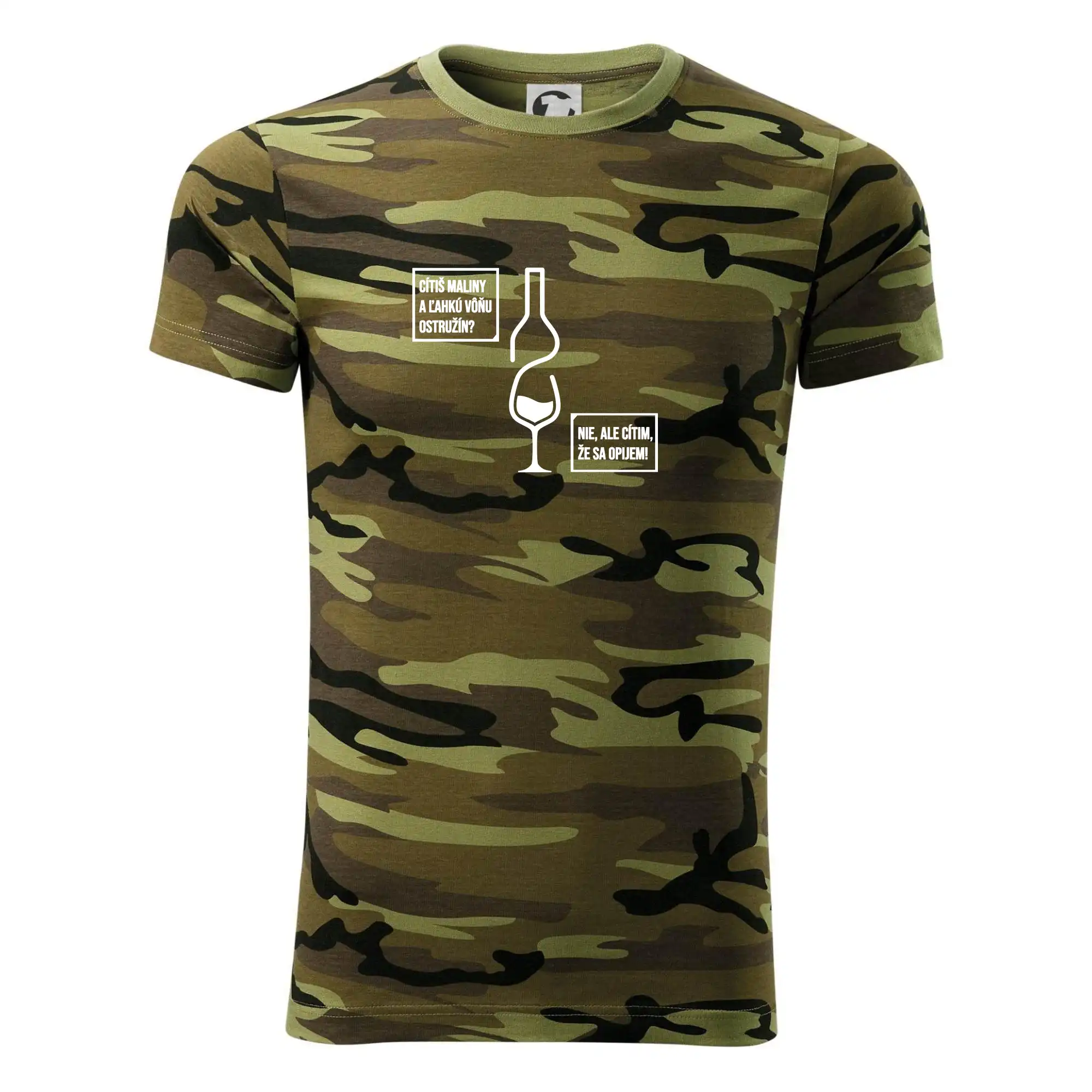 Tričko strednej gramáže vo farbách camouflage. Strih s bočnými švami. Lem priekrčníku z rebrového úpletu s prídavkom 5% elastanu. Vnútorná časť zadného priekrčníka začistená páskou vo farbe camouflage.