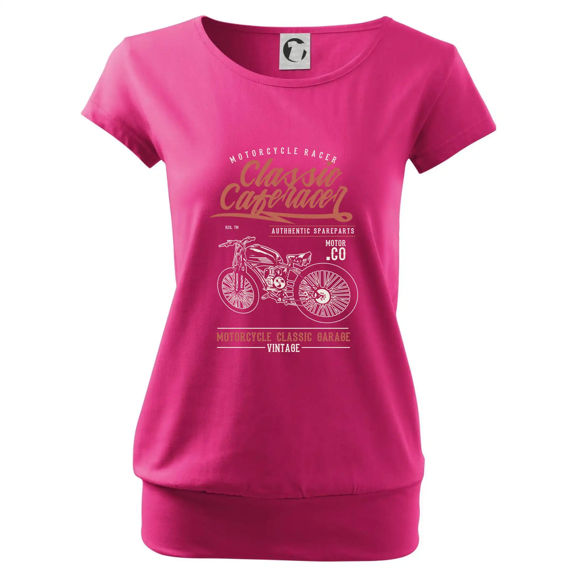 Trendové dámske tričko s veľmi krátkym rukávom, voľnejšieho strihu, v dolnom kraji všité do širokého lemu. Okrúhly priekrčník s úzkym lemom zo zhodného materiálu.