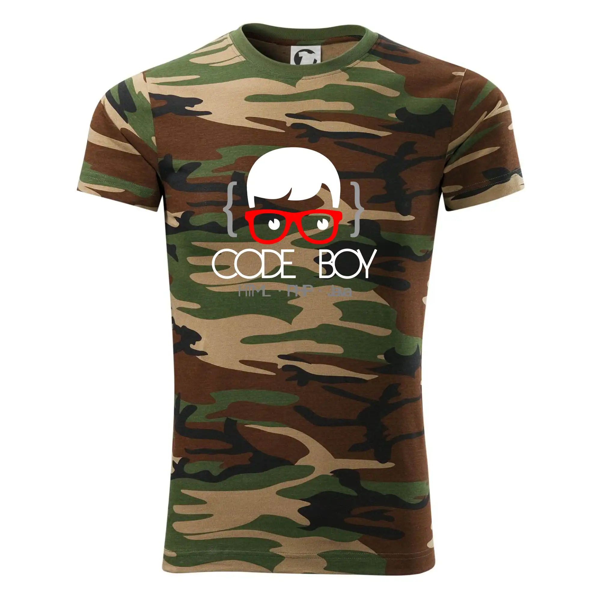 Tričko strednej gramáže vo farbách camouflage. Strih s bočnými švami. Lem priekrčníku z rebrového úpletu s prídavkom 5% elastanu. Vnútorná časť zadného priekrčníka začistená páskou vo farbe camouflage.