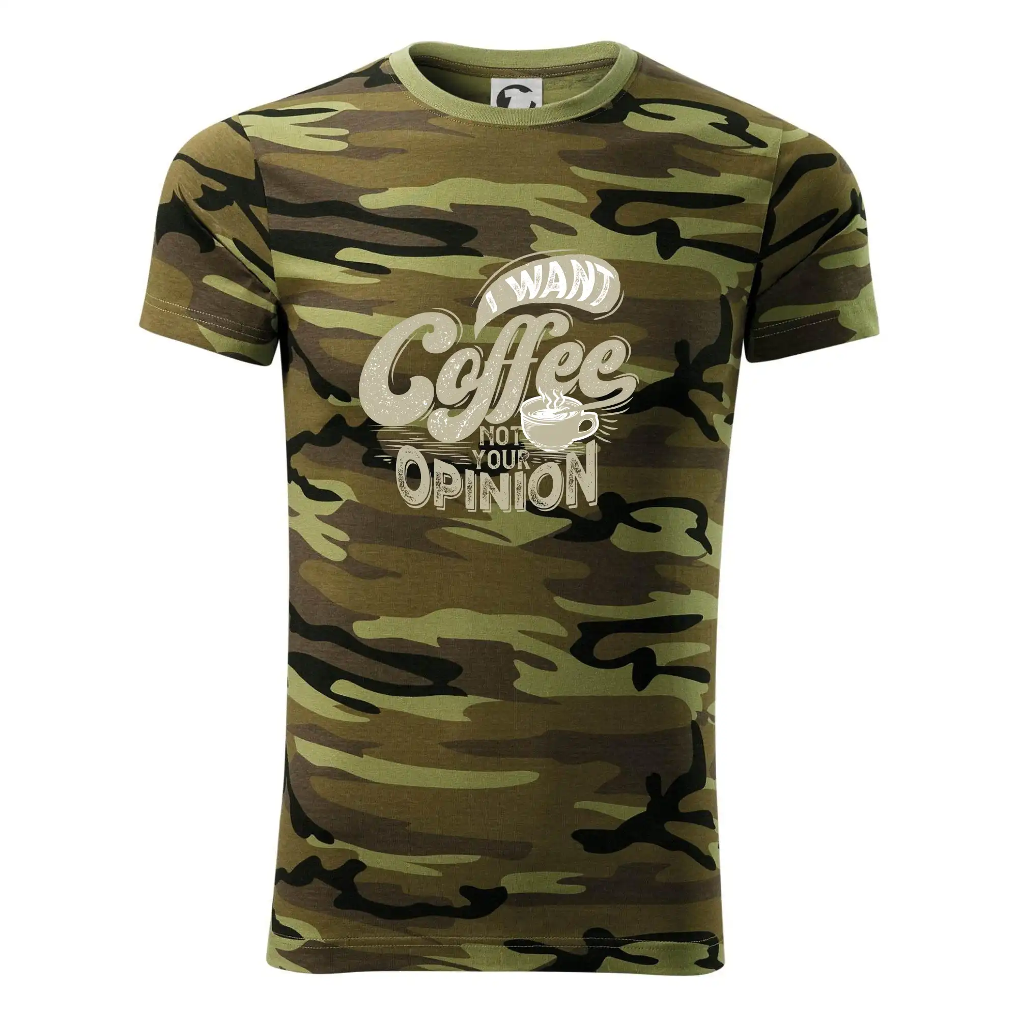 Tričko strednej gramáže vo farbách camouflage. Strih s bočnými švami. Lem priekrčníku z rebrového úpletu s prídavkom 5% elastanu. Vnútorná časť zadného priekrčníka začistená páskou vo farbe camouflage.