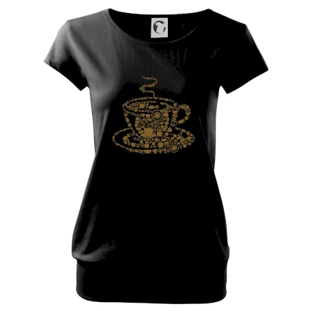 Trendové dámske tričko s veľmi krátkym rukávom, voľnejšieho strihu, v dolnom kraji všité do širokého lemu. Okrúhly priekrčník s úzkym lemom zo zhodného materiálu.