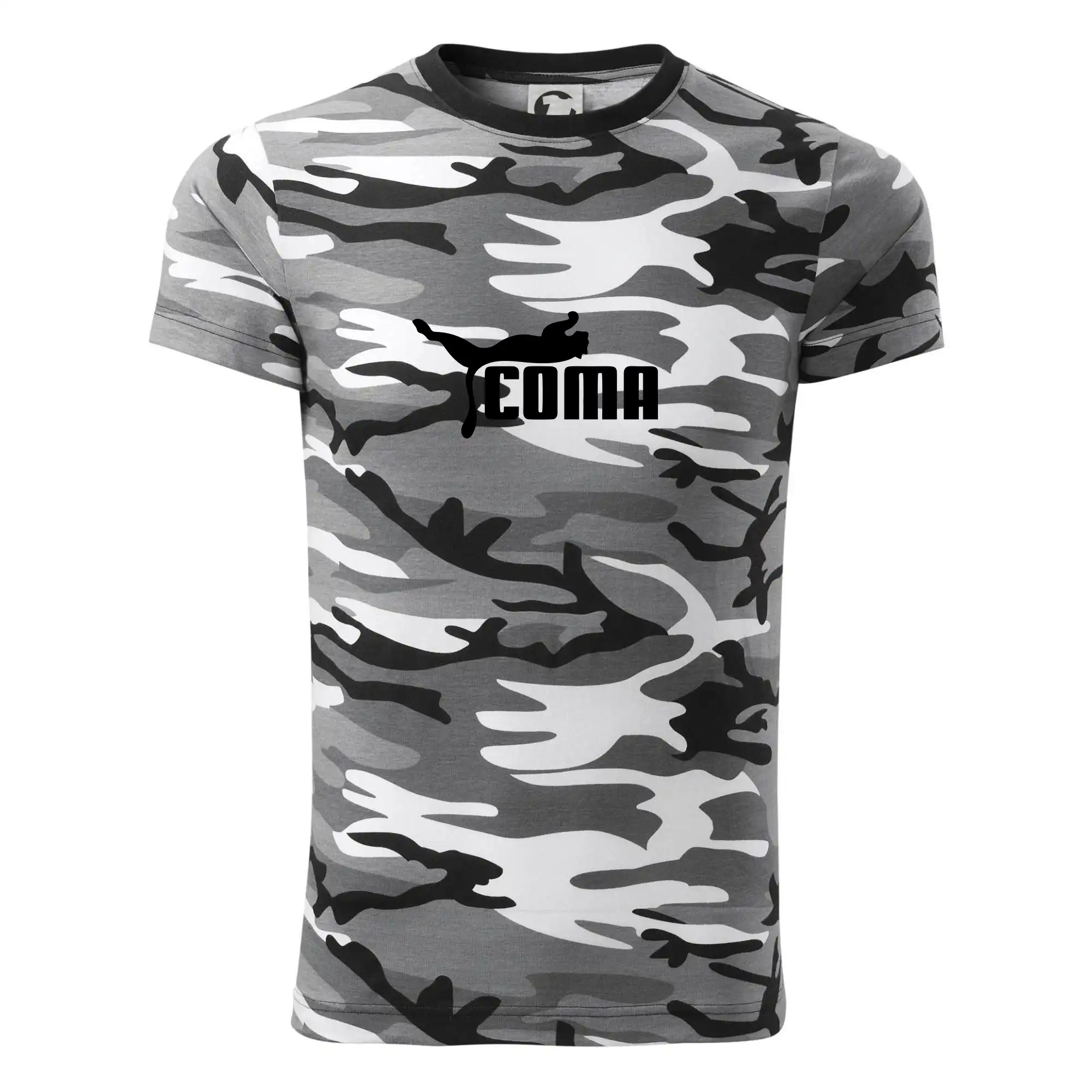 Tričko strednej gramáže vo farbách camouflage. Strih s bočnými švami. Lem priekrčníku z rebrového úpletu s prídavkom 5% elastanu. Vnútorná časť zadného priekrčníka začistená páskou vo farbe camouflage.