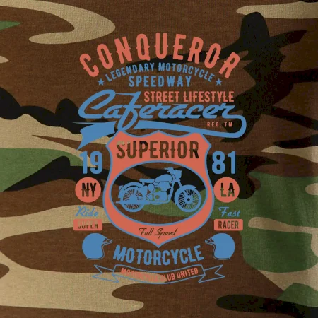 Tričko strednej gramáže vo farbách camouflage. Strih s bočnými švami. Lem priekrčníku z rebrového úpletu s prídavkom 5% elastanu. Vnútorná časť zadného priekrčníka začistená páskou vo farbe camouflage.