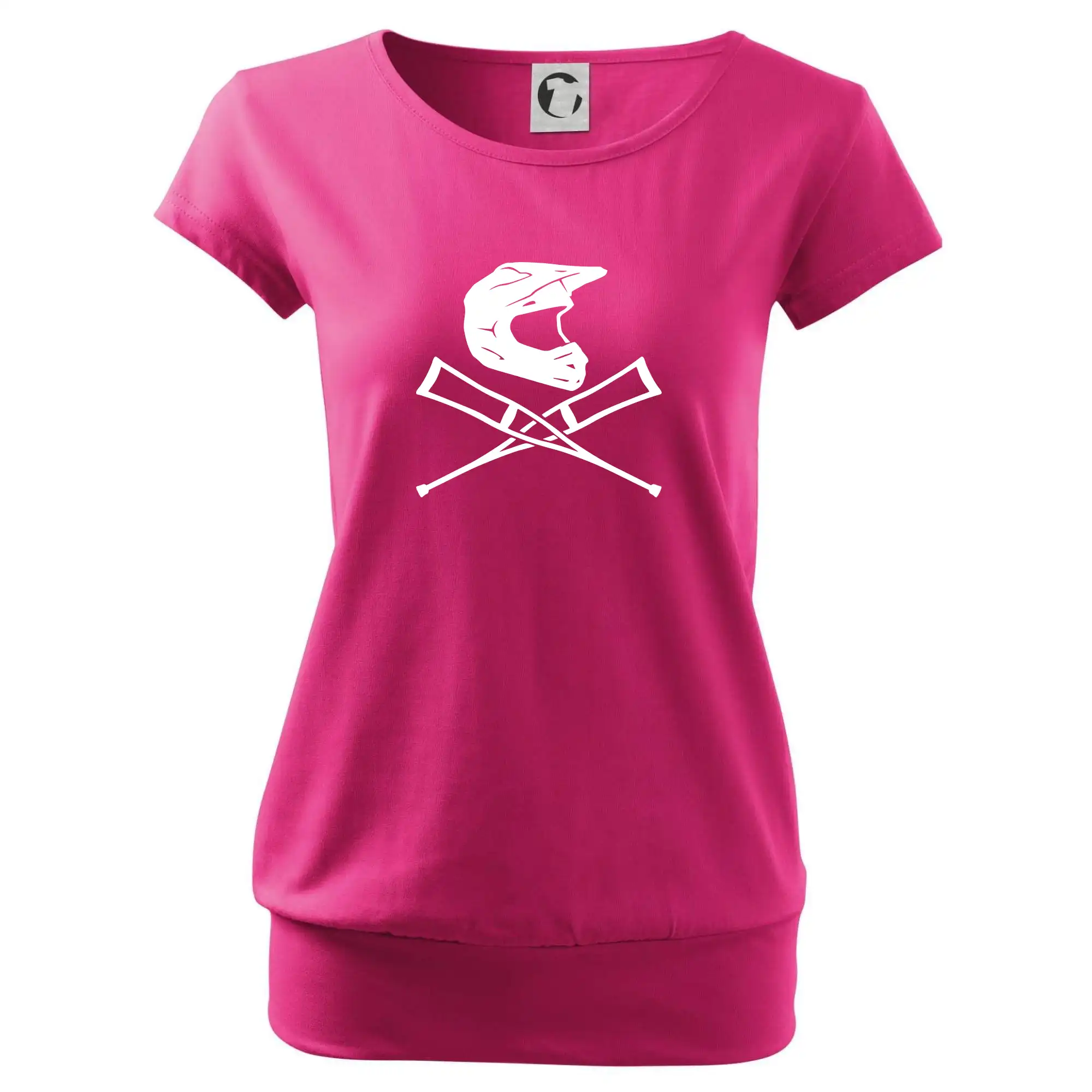 Trendové dámske tričko s veľmi krátkym rukávom, voľnejšieho strihu, v dolnom kraji všité do širokého lemu. Okrúhly priekrčník s úzkym lemom zo zhodného materiálu.