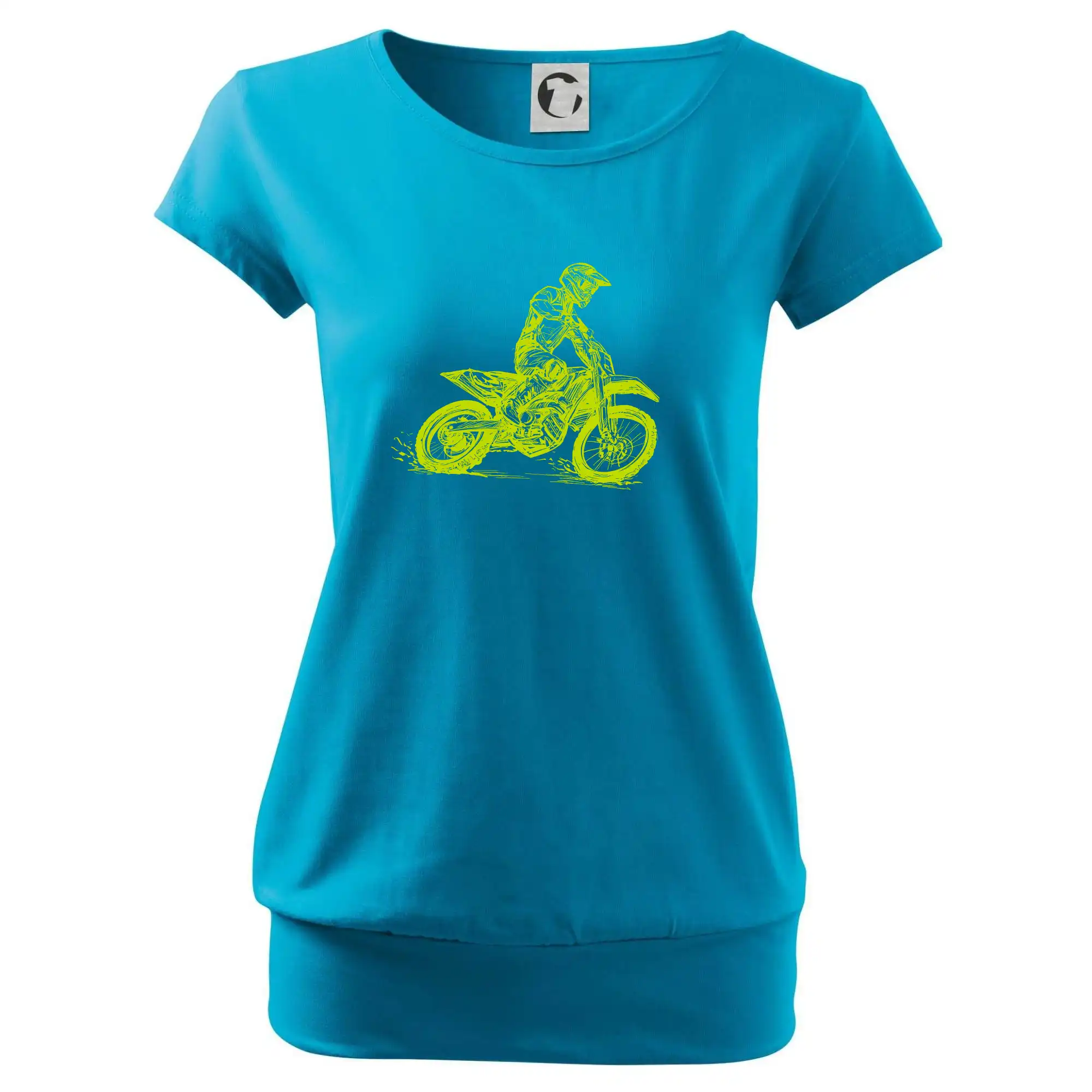 Trendové dámske tričko s veľmi krátkym rukávom, voľnejšieho strihu, v dolnom kraji všité do širokého lemu. Okrúhly priekrčník s úzkym lemom zo zhodného materiálu.