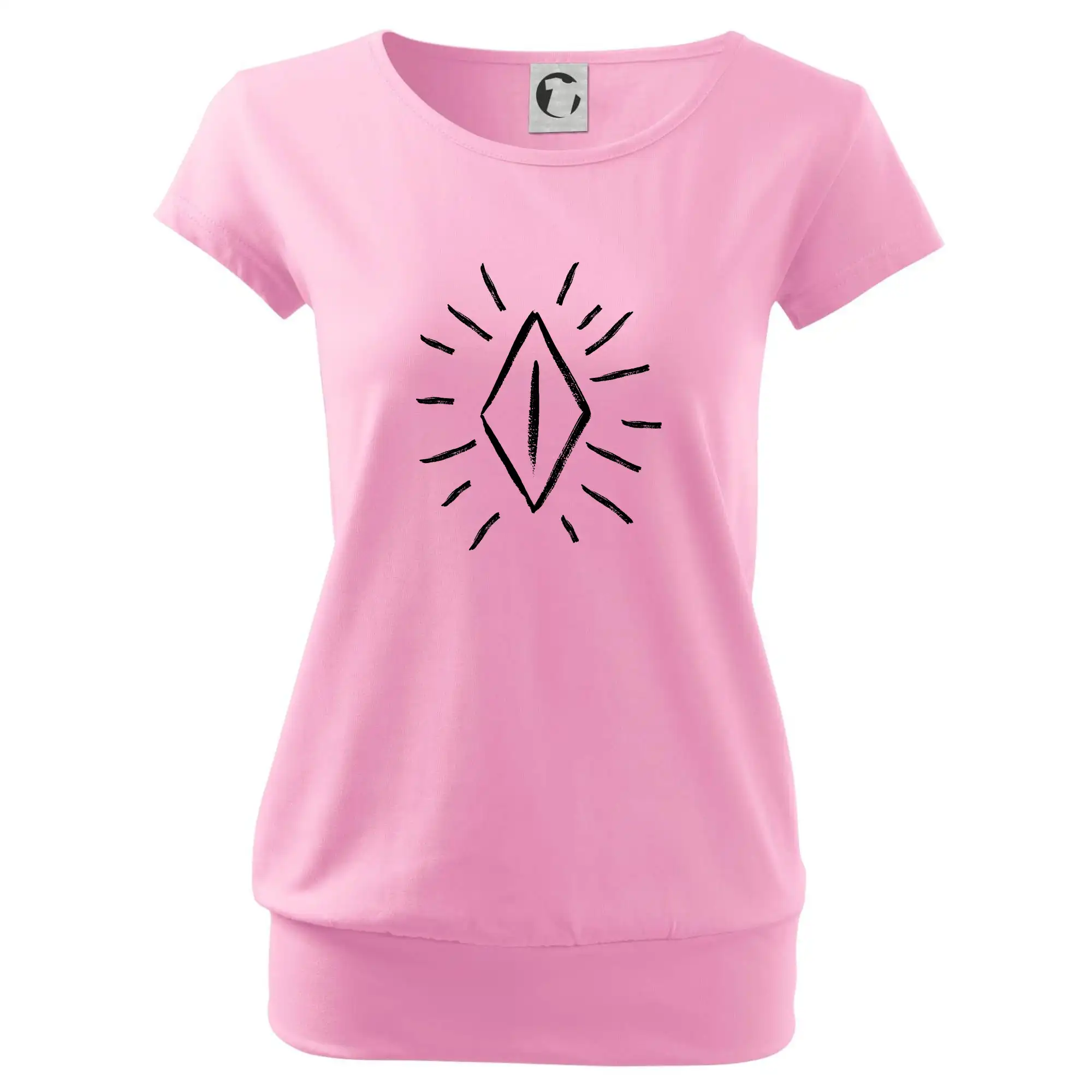 Trendové dámske tričko s veľmi krátkym rukávom, voľnejšieho strihu, v dolnom kraji všité do širokého lemu. Okrúhly priekrčník s úzkym lemom zo zhodného materiálu.