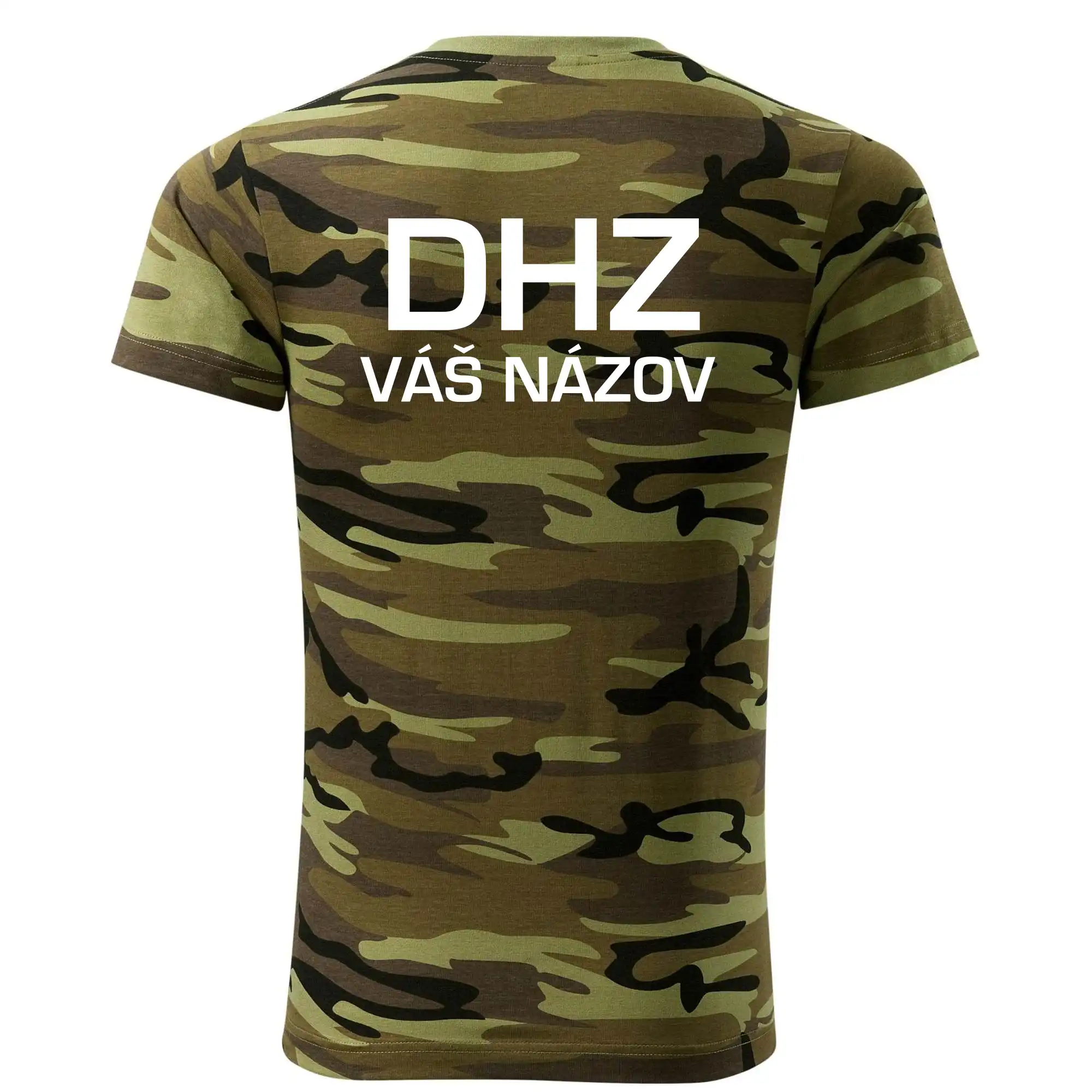 Tričko strednej gramáže vo farbách camouflage. Strih s bočnými švami. Lem priekrčníku z rebrového úpletu s prídavkom 5% elastanu. Vnútorná časť zadného priekrčníka začistená páskou vo farbe camouflage.