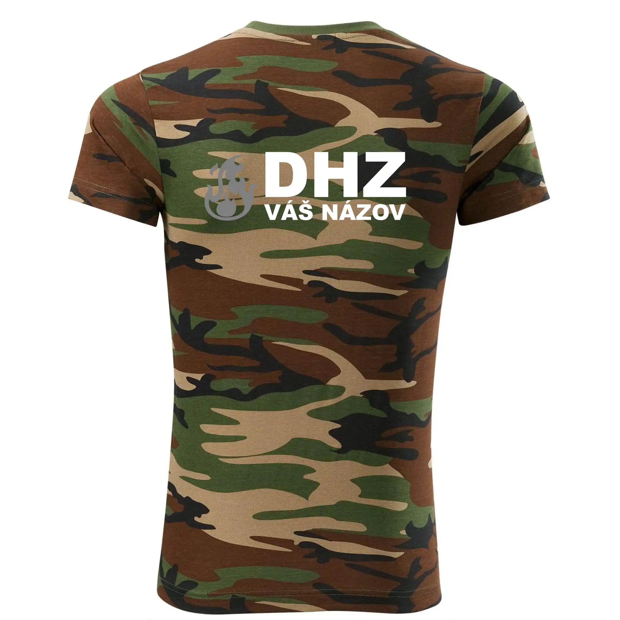 Tričko strednej gramáže vo farbách camouflage. Strih s bočnými švami. Lem priekrčníku z rebrového úpletu s prídavkom 5% elastanu. Vnútorná časť zadného priekrčníka začistená páskou vo farbe camouflage.