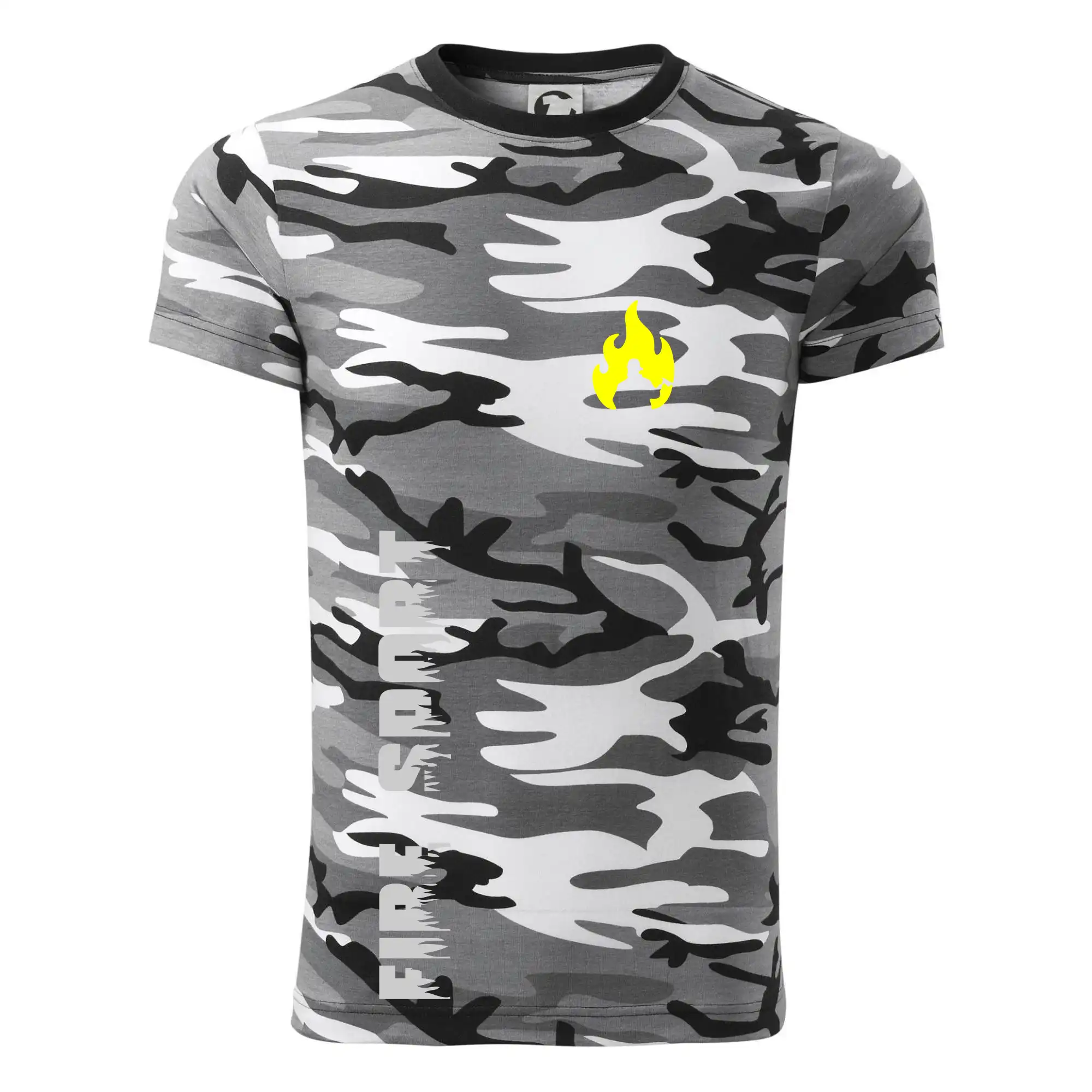 Tričko strednej gramáže vo farbách camouflage. Strih s bočnými švami. Lem priekrčníku z rebrového úpletu s prídavkom 5% elastanu. Vnútorná časť zadného priekrčníka začistená páskou vo farbe camouflage.