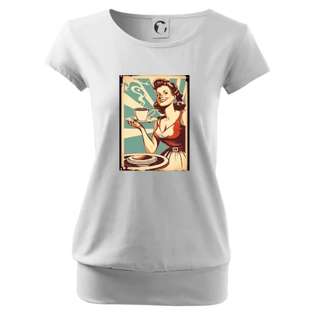 Trendové dámske tričko s veľmi krátkym rukávom, voľnejšieho strihu, v dolnom kraji všité do širokého lemu. Okrúhly priekrčník s úzkym lemom zo zhodného materiálu.