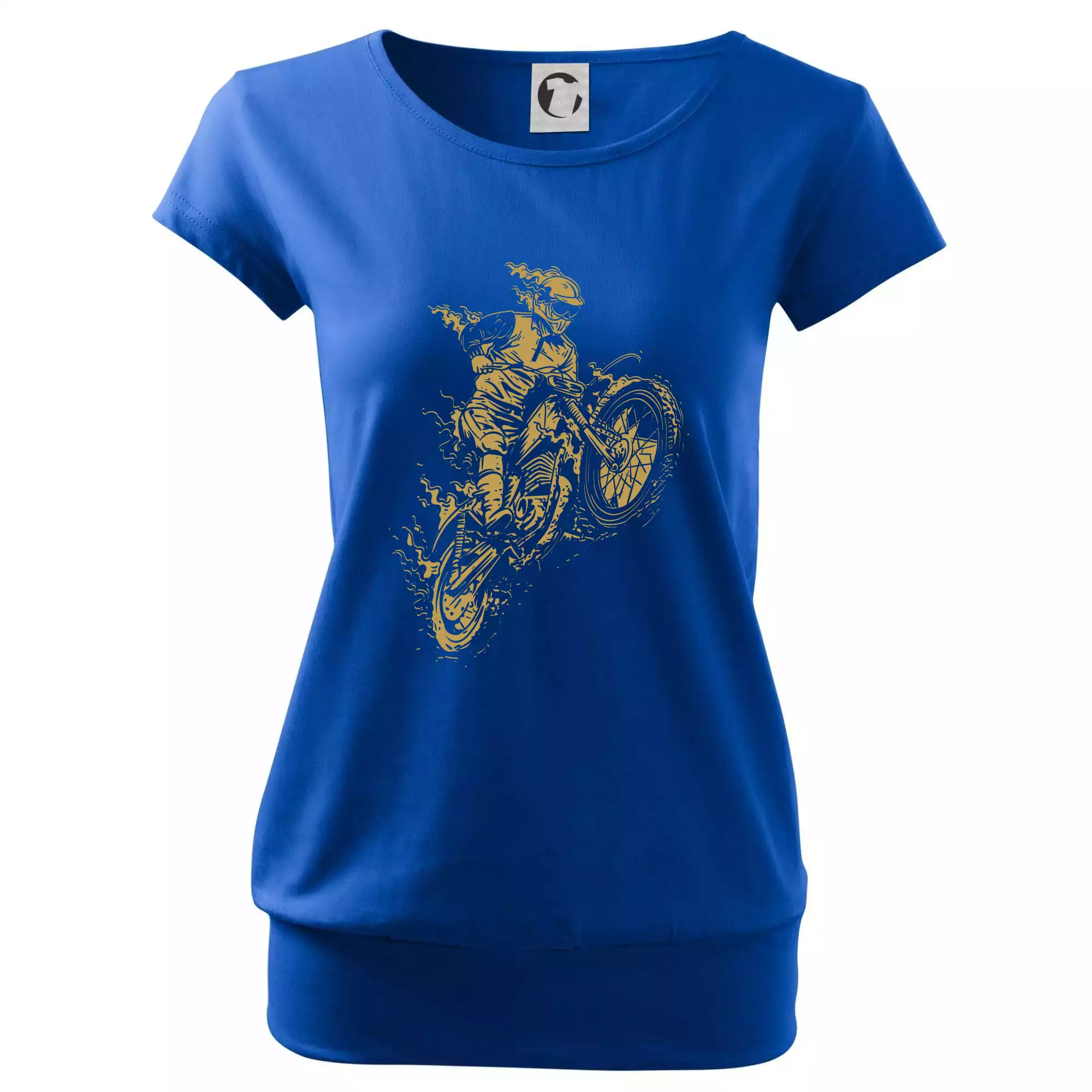 Trendové dámske tričko s veľmi krátkym rukávom, voľnejšieho strihu, v dolnom kraji všité do širokého lemu. Okrúhly priekrčník s úzkym lemom zo zhodného materiálu.