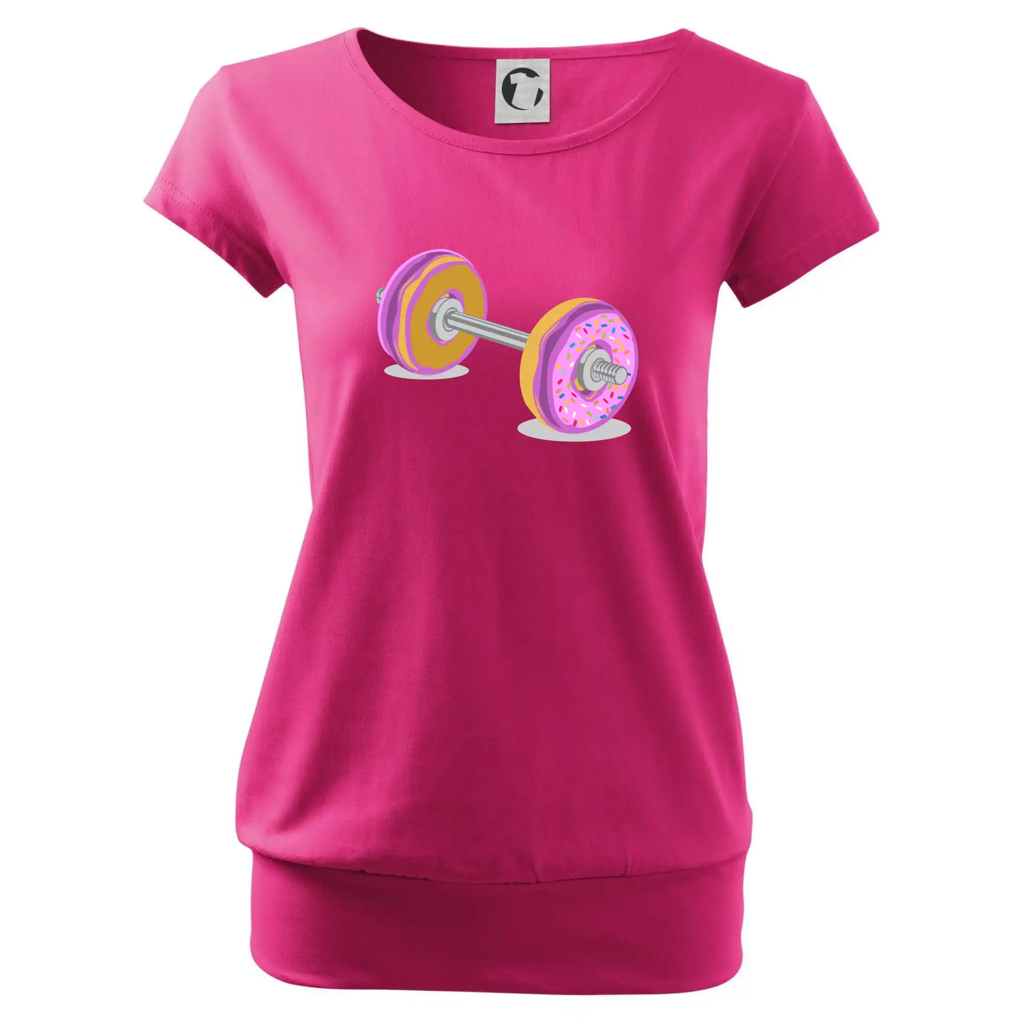 Trendové dámske tričko s veľmi krátkym rukávom, voľnejšieho strihu, v dolnom kraji všité do širokého lemu. Okrúhly priekrčník s úzkym lemom zo zhodného materiálu.